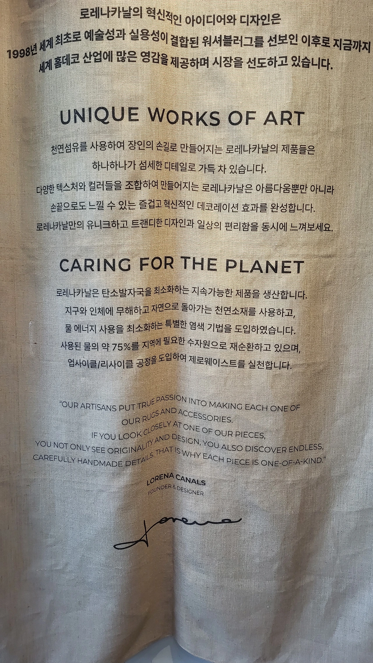 기억에 남는 브랜드는 1층에 팝업 전을 하고 있는 Lorena canals. 세탁하여 쓸 수 있는 친환경 러그들이 있었다. 동물 모양으로 만들어진 러그도 있었고 귀여웠다.