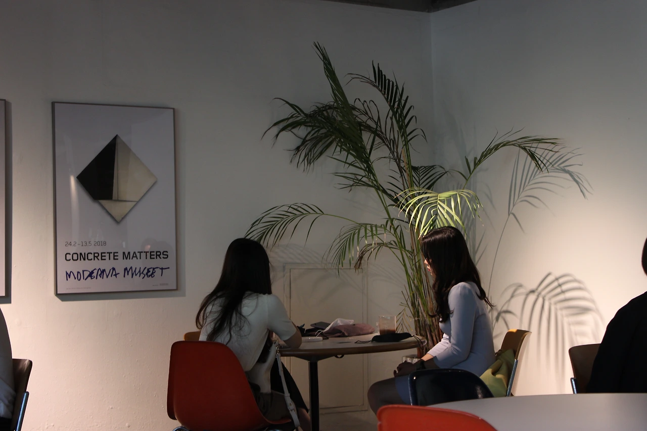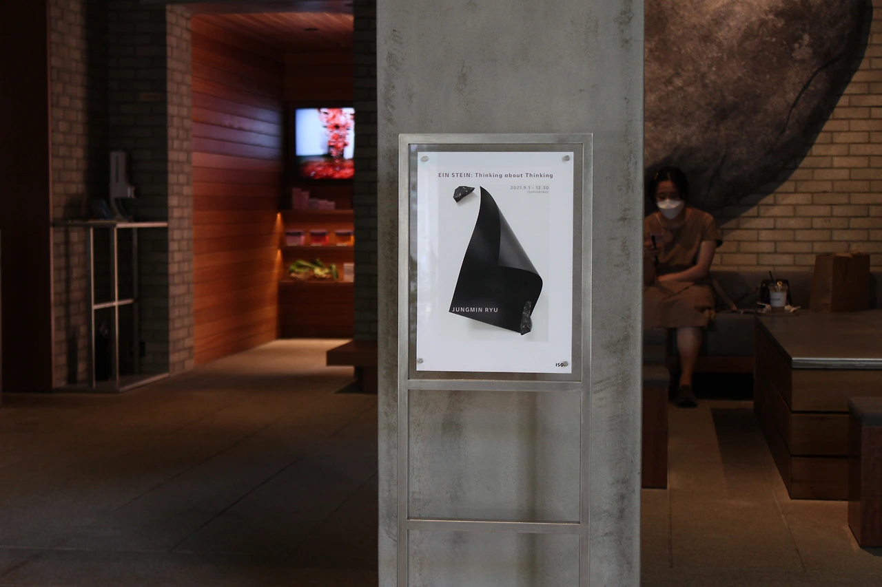 1층에 넓은 테이블과 전시가 진행되고 있다. 전시 공간을 구분하여 사용하기보다 공간 내에 작품이 스며들도록 연출했다. 요즘 카페나 공간을 둘러보면 자연친화적으로 느껴지는 소재를 사용하고 주변에 자연경관이 없다면 창가 앞 화단을 만들어 자연적인 분위기를 연출한다. 조명도 천장 안으로 들어가는 간접 조명을 사용하여 눈의 피로도를낮추도록 디자인되었다.