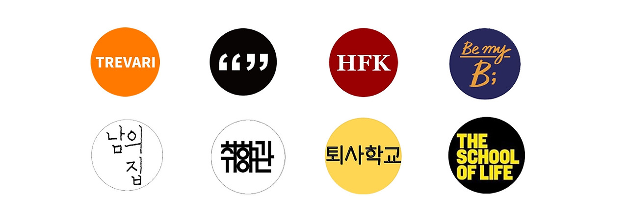 첫째줄 왼쪽부터, 트레바리, 문토, HFK, be my b / 둘째줄 왼쪽부터 남의집프로젝트, 취향관, 퇴사학교, 인생학교