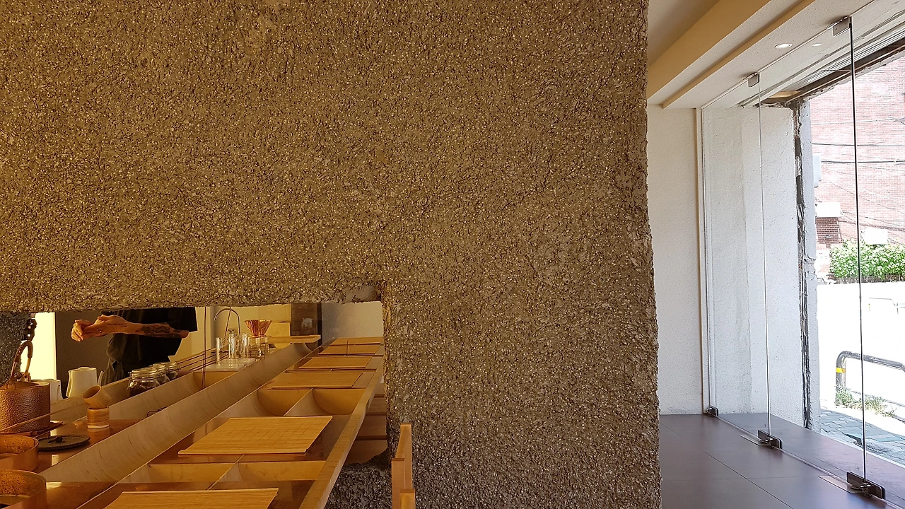 마감 재질이나 색감, 그리고 동양적인 느낌을 주는 돌과 천 등 요소가 자연스럽게 어우러진 모습이다.