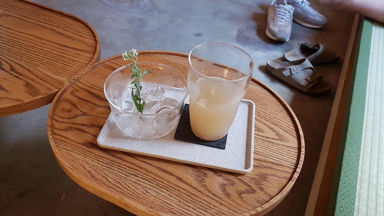 1층 매장 모습 전반적인 인테리어가 동양적인 느낌이고 자연친화적인 콘셉트로 만들어졌지만 소비자 입장에서 바닥을 걸을 땐 불편하긴 했다. 의자 또한 등받이 없는 나무 의자로 만들어져 꽃꽂이 허리를 세우고 마시지 않으면 안 될 것 같았다. 하지만 그 안에서 섬세하게 공간 디자인을 신경썼다는 걸 알 수 있었다.
