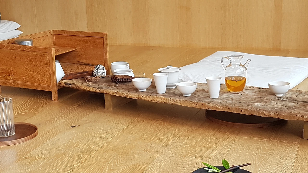 차를 마시는 과정 중에 물이 잘 흐르는 것을 방지하기 위해 상 위에 나무판이 깔려있다. 어릴 적 김밥말이가 떠오르는 비주얼이지만 경제적이고 효율적이다.