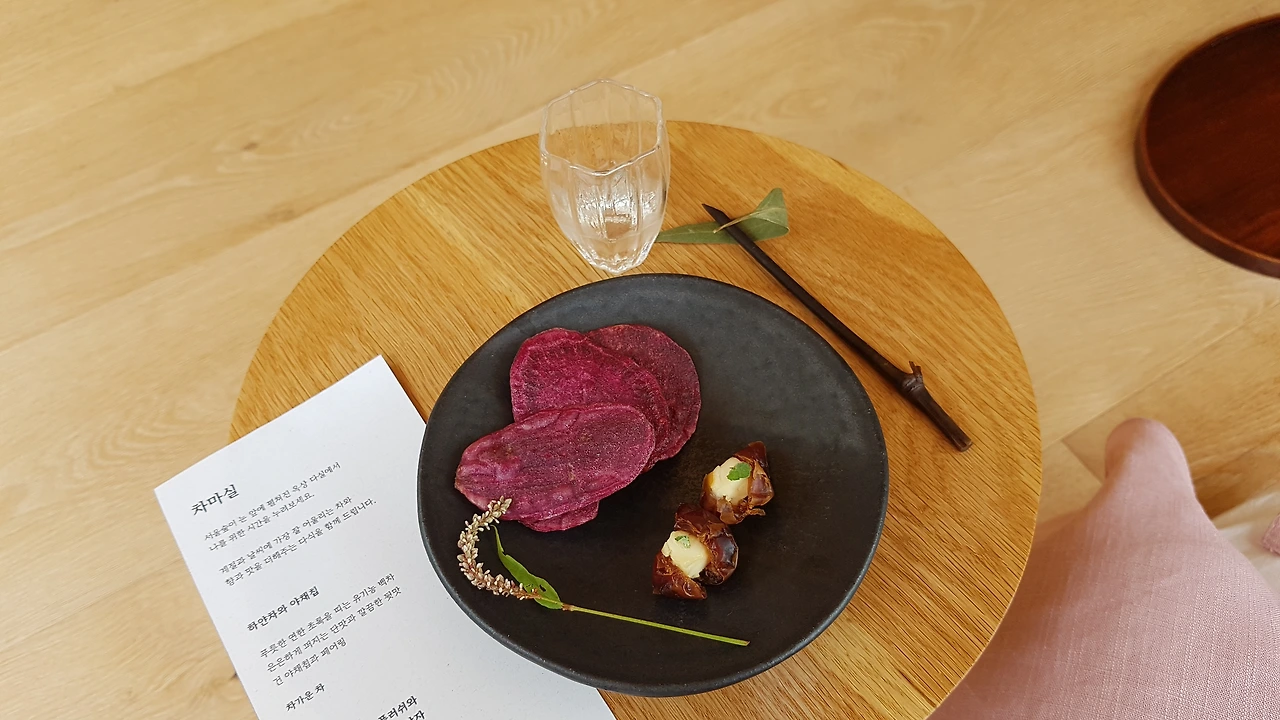 말린 고구마, 대추 다과이 날 마신 차는 어린 잎차와 홍차로 내 몸에 잘 맞지 않아서 한 잔을 제대로 마시기 어려웠다. 말차나 홍차는 카페인 함량이 높아 생리 중엔 마시는 순간부터 컨디션이 안 좋아지는 걸 직감한다. 몸이 평소 차고 생리통 있으신 분들께는 녹차, 홍차를 추천해드리지 않는다. 카페인은 칼슘과 철분을 몸 밖으로 배출시키는 성질이 있어서 임신, 생리 중에는 몸을 따뜻하게 해주는 쑥차나 자극적이지 않은 배차, 호박차를 추천드린다. 그린랩에서 차 시음 시간은 2시간 정도고 몇 가지 가벼운 다과와 함께 먹으면서 입 안의 심심함을 달랠 수 있었다.