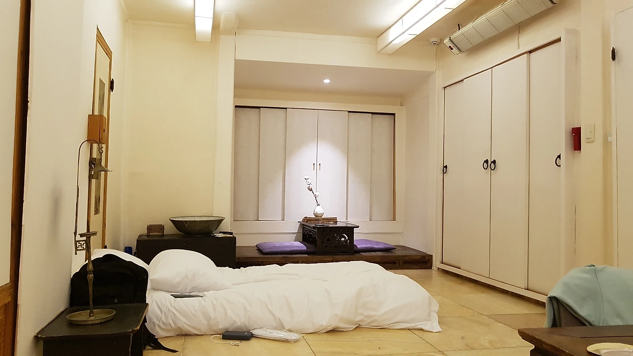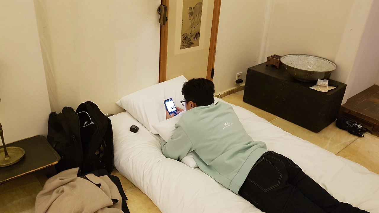 방은 보다시피 모두 창호지 같은 종이로 만들어진 창이고, 바닥은 옥으로 만든 온돌로 되어있어 내부가 따뜻하다. 시끄러울 거라고 생각했는데 낮이고 밤이고 차가 많이 안 다니는 동네라 그런지 골목 안에 한옥이 자리 잡고 있어 정말 고요했다. 새소리도 안 들리고 이런 곳에서 살면 정말 세상 돌아가는 소리 안 듣고 살아갈 수 있을 것 같았다.