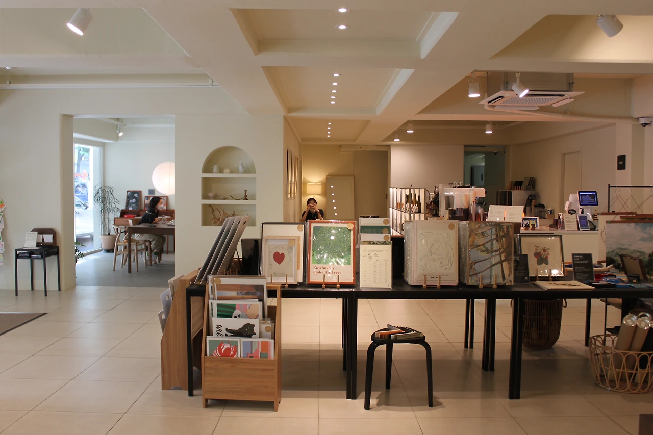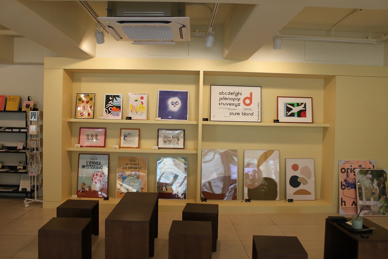 공간에서 눈여겨 볼만한 점은 카페를 전시장처럼 만들어 사람들이 작품을 편히 볼 수 있도록 구성했다는 점이다. 매장 중앙엔 중, 소형 포스터와 액자를 두어 고객들이 편히 작품을 볼 수 있게끔 해놓고 대형 작품은 벽면에 배치하여 공간을 효율적으로 사용하고 있다.