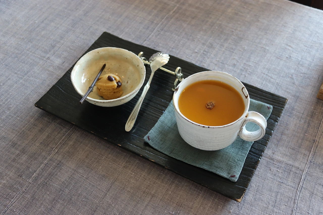 쌀알과 얇게 잘린 호박 앙금이 가득 들어있는 호박차를 주문했다. 디저트로 설탕에 절인 팥 알갱이가 들어있는 떡이 나왔고 음식이 이것저것 잘 들어가지 않는 오전에 적당히 부담 없이 먹을 수 있는 디저트다. 개인적으로는 건더기가 많은 호박차를 상상한 건 아니었지만 밥알이 많다 보니 거의 끼니를 먹는 것 같았다.