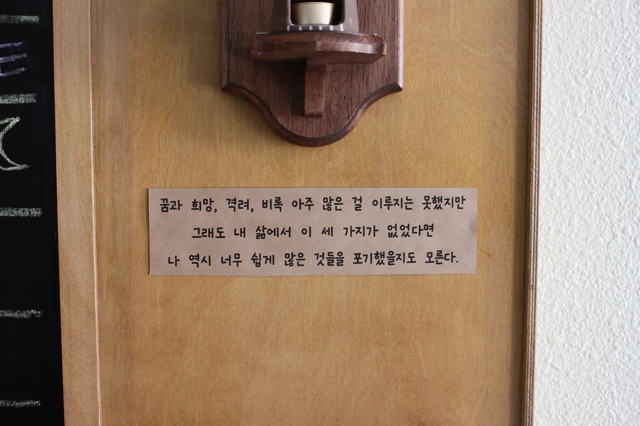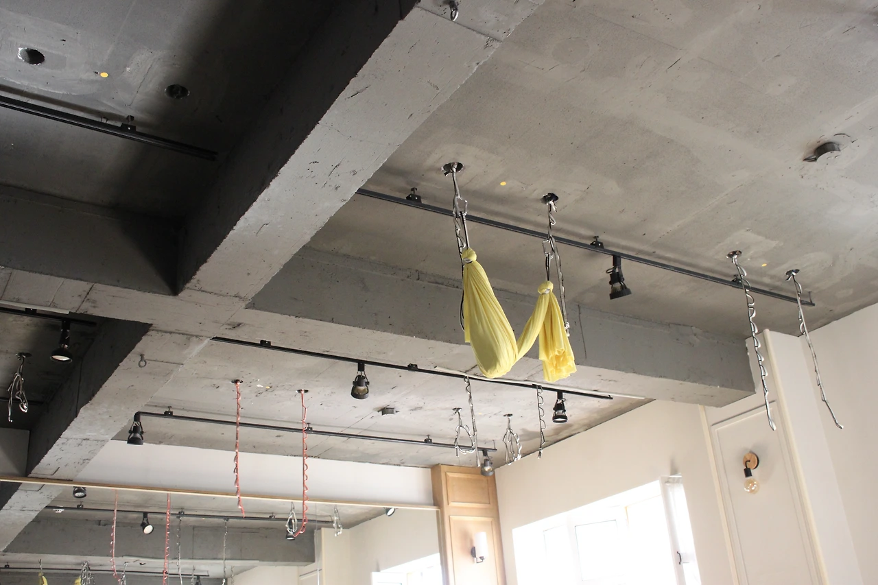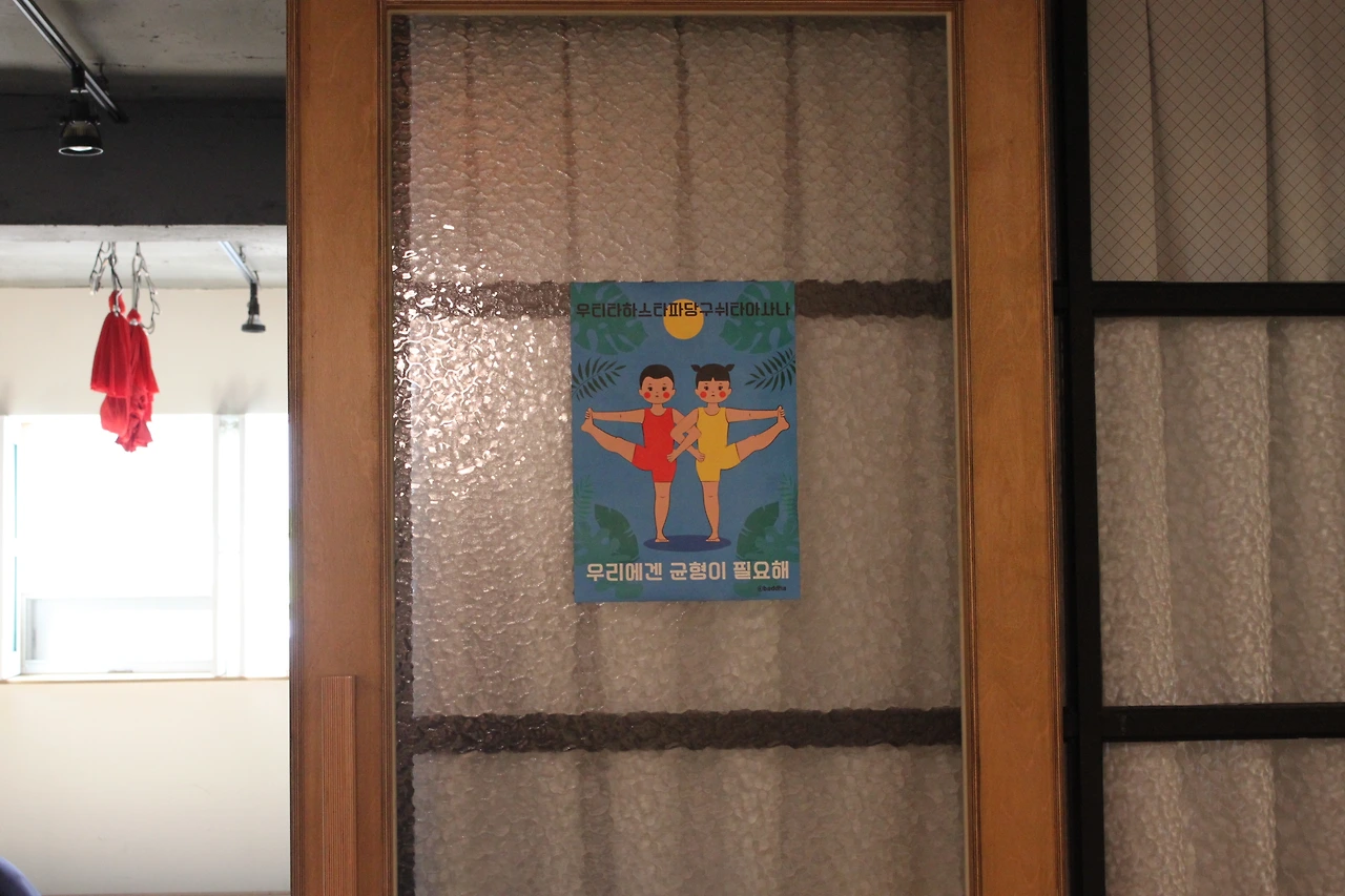 플라잉 요가, 하타요가를 배울 수 있는 곳. 공간이 넓고 아늑했다. 건물은 을지로와 같이 높은 계단식 건물이고 회색 시멘트 벽면 사이사이 힐링 글귀들을 마주할 수 있다. 공간 내부에는 작은 식물과 책 그리고 나무로 만들어진 미닫이 문이 중앙에 위치되어 있다.