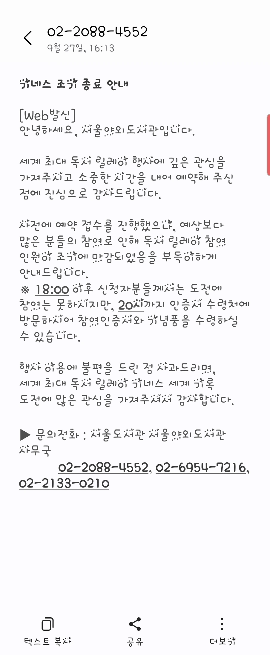 저는 결국, 기네스북 경신을 위해 제 목소리를 남기지 못했습니다. 광화문으로 가는 전철에서 이런 문자를 받았거든요.