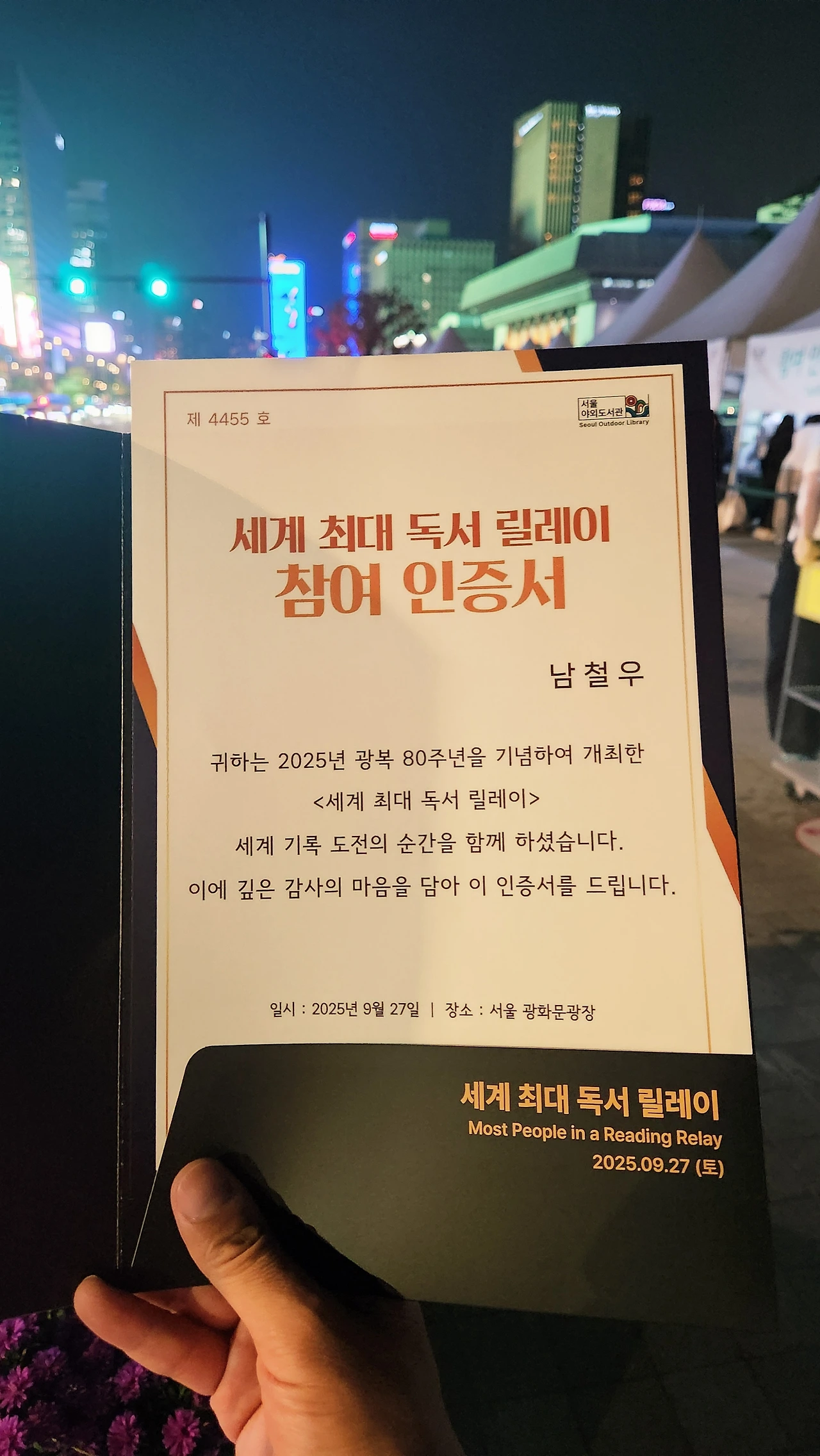 광화문 광장에 도착하니, 이미 철수 작업이 꽤 진행되었더라고요. 그래서 관계자로 보이는 사람을 만나 이야기를 나눠봤습니다. 그분의 말에 따르면, 낭독자 간 공백이 10초를 넘으면 도전이 취소되는 규정 때문에 현장에서 참여한 사람의 비중이 높아 예약 시간이 늦은 사람에게 기회가 돌아가지 않았다고 합니다. 참가를 원하는 사람이 워낙 많았고, 그래서 예정된 3,180명 보다 352명이 많은 3,532명으로 기네스 도전은 성료되었다네요.