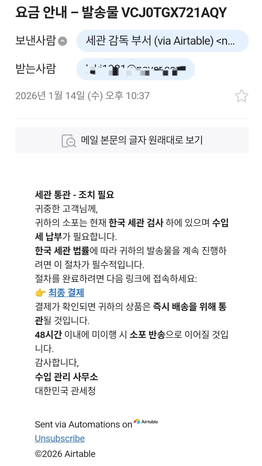 그렇다 보니, 지금도 개인 통관 번호를 자주 사용하는 분들에겐 메일 내용이 가볍지 않을 수도 있겠다는 생각이 들었습니다. 그래서 알려드리려고 해요. 메일을 받고 놀라기 전에, 그럴 일이 있었나 한 번은 더 주변을 돌아보시는 걸 추천해 드립니다. 공무원은 이런 식으로 알려주지 않거든요. 그러니 비슷한 메일을 받으셨다면, 메일에 첨부된 링크는 절대 누르시면 안 됩니다.