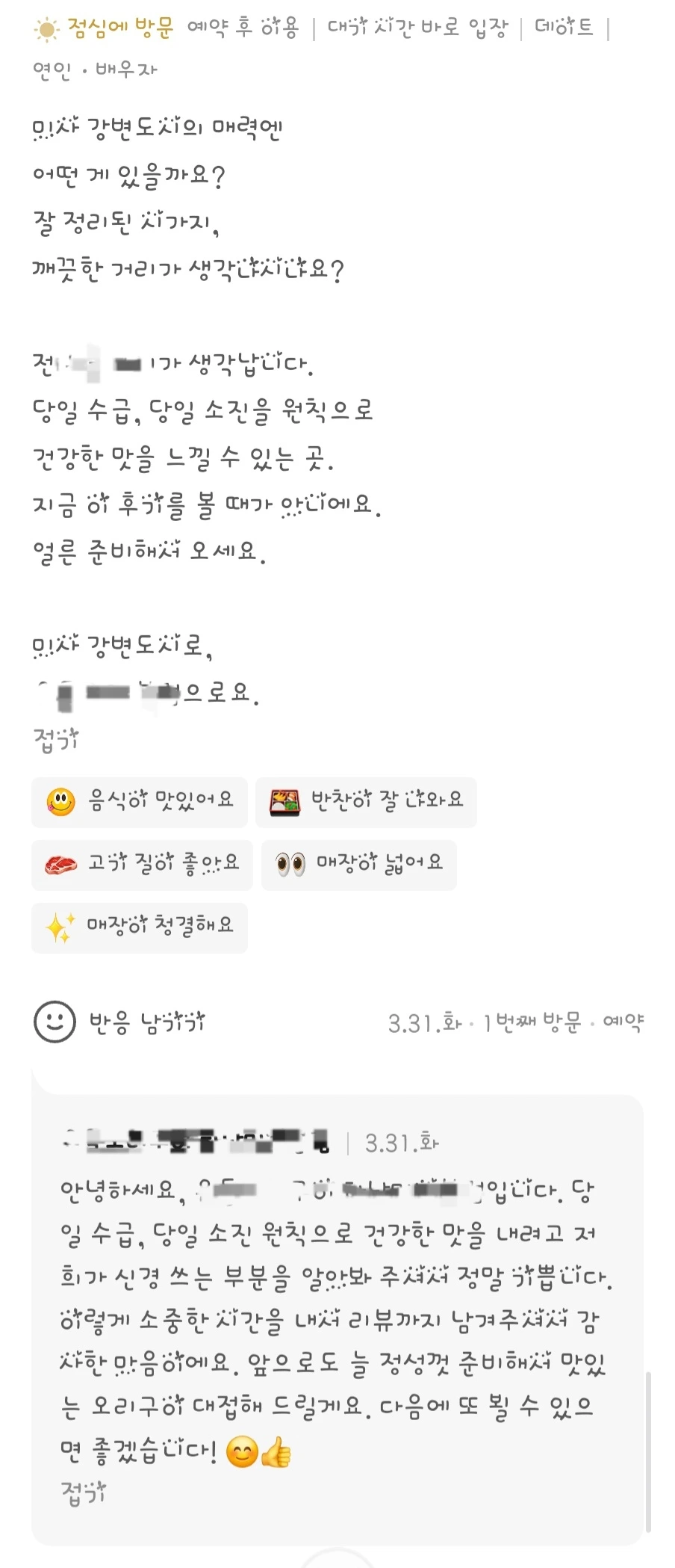 키오스크, 서빙 로봇이 세상을 장악했습니다. 한 번 보고 마는 손님과 직원의 관계가 변했어요. 이젠 한 번도 보지 않는 관계가 되어 버렸습니다. 그렇기에 식당에서 밥만 먹고 나오지 않았다는 게 소중해졌습니다. 각박한 세상에서 만난 귀인이었습니다. 그분의 살가움은 '친절하다'라는 형용사로는 표현할 수 없어요. 그래서 그 직원에게 감사한 마음을 담아 정성을 들인 가게 후기를 남겼습니다. 곧 고맙다는 사장님의 답변이 달렸어요. 그 직원에 그 사장님이네요.