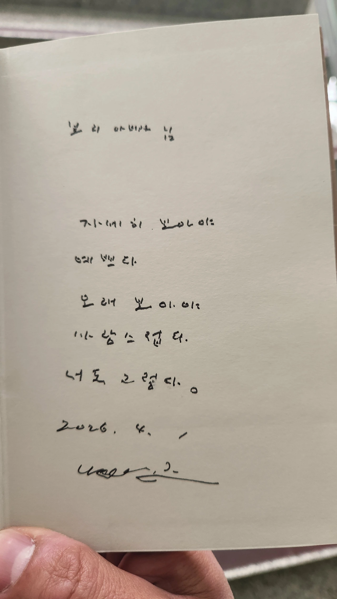 본명을 쓸지 필명을 쓸지 잠시 고민했습니다. '남철우'와 '보리아빠'는 잠시 마음속에서 아옹다옹했지만, 결국 보리아빠가 이겼습니다. 아직 한참 부족하지만 그래도 '쓰는 사람'으로 소개하고 싶은 게 욕심이었거든요. 전 하고팠던 말을 품고 차례를 기다렸고, 보리아빠는 선생님께 인사드리고는 가지고 간 시집을 건넸습니다.