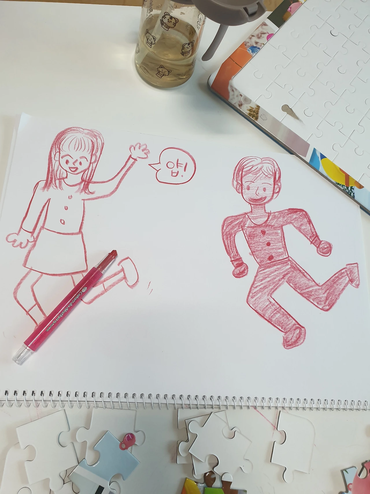 하지만 그런 건 중요하지 않습니다. 이 그림 덕분에 고작 10분 남짓이었지만, 업무에 대한 걸 잠시 잊기엔 충분했으니까요. 나 잡아봐라~~ 하는 재미난 그림을 그려준 아내에게 고맙고, 엄마 아빠를 그려달라고 한 아이에게도 고맙습니다. 가족들 덕분에 오늘도 감사하는 마음을 갖고 살게 됩니다.