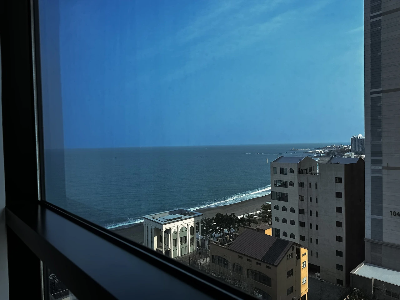 어느덧 하차 버스정류장에 가까워지자 드넓은 바다와 고층의 아파트와 몇몇 프랜차이즈 호텔이 눈에 들어오기 시작했다 호텔 안내에 나왔던 바다와 같은 모습으로 펼쳐진 해변을 보자 제대로 왔다는 안도감이 밀려왔다