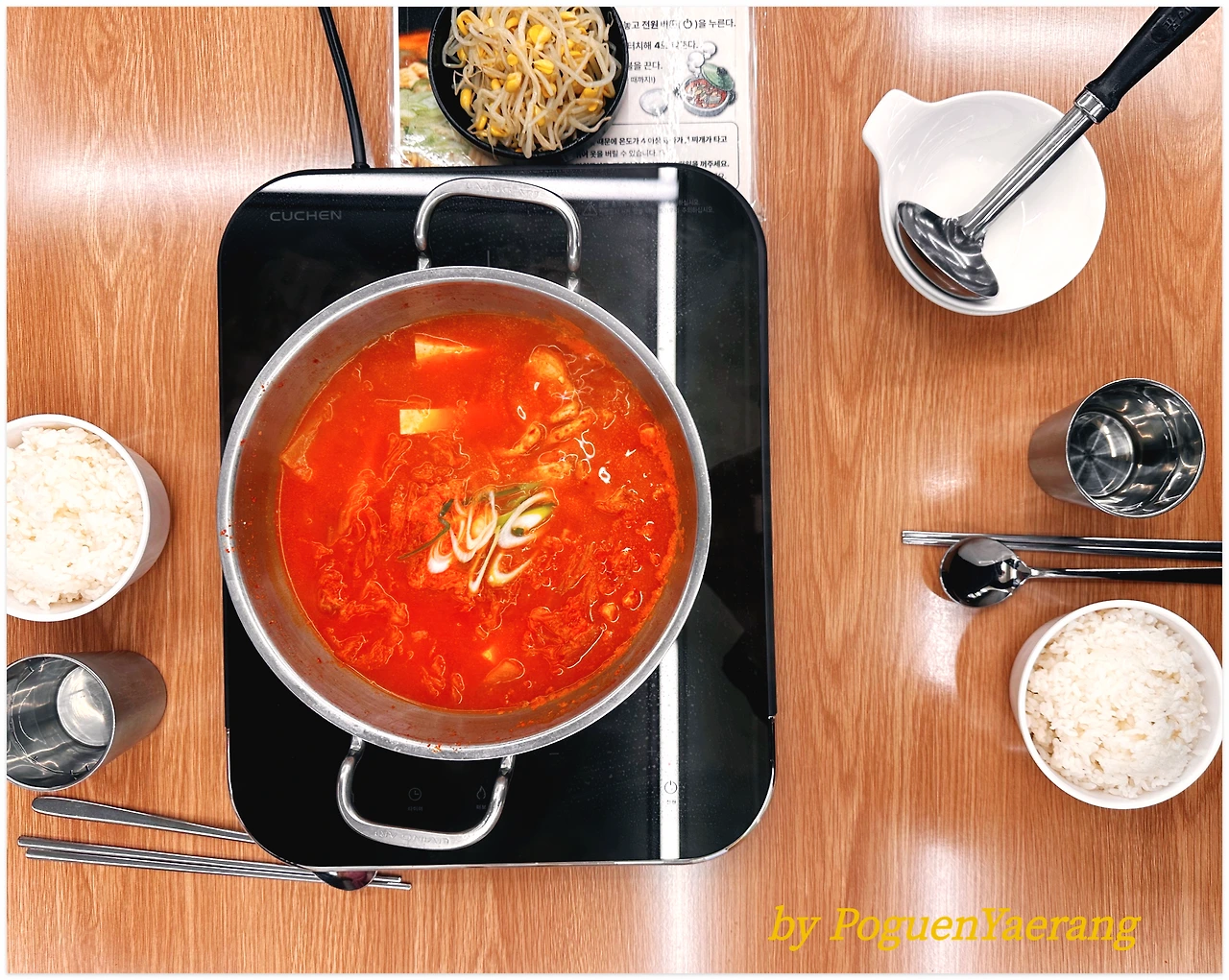 김치찌개가 나올 동안 물을 떠 와 마시며 인덕션에서 음식을 데워 먹는 방법을 살폈다. 그렇게 음식을 기다리다가 우리 호출 번호를 부르니 오픈 주방 앞에서 냄비를 가져왔다. 그런 뒤에야 밥과 콩나물무침을 떠 왔다. 찌개가 나올 동안 콩나물과 밥을 떠 오는 편이 나을 듯싶어 뒷날은 그렇게 시간을 활용했다.