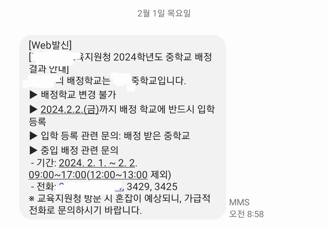 기다리던 중학교 배정 문자이다. 추첨으로 뽑히는 국제중학교에는 선정되지 못해서, 바로 집 옆에 있는 중학교에 배정되는 건 당연한 결과였다. 서울의 경우 근거리 중학교에 자동으로 배정된다.