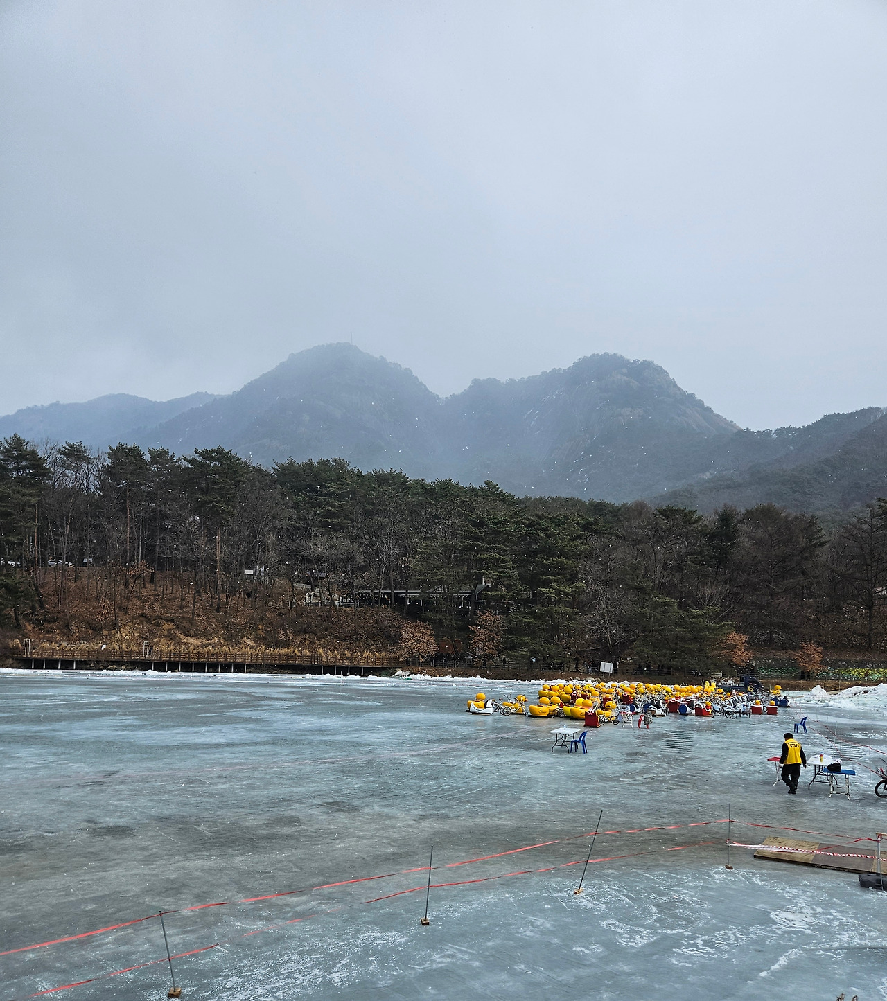 포천 산정호수 썰매축제는 벌써 99회를 맞이한 지역대표 축제이다. 지역주민들이 주도적으로 운영하는 썰매축제는 노란색의 러버덕썰매가 이 축제의 시그니처로 자리 잡아 인스타그램에서도 핫한 인기를 누리는 축제이다. 산정호수를 여행 목적지로 정하고 검색을 하던 중, 작년 12월 30일부터 올해 2월 중순까지 예정되어 있는 산정호수 썰매축제를 알게 되었다. 그냥 온천만 하고 오는 것보다는 귀여운 노란 오리썰매를 타면 아이들도 즐겁고 인스타그램에 올릴만한 사진도 찍을 수 있겠다 싶었다.