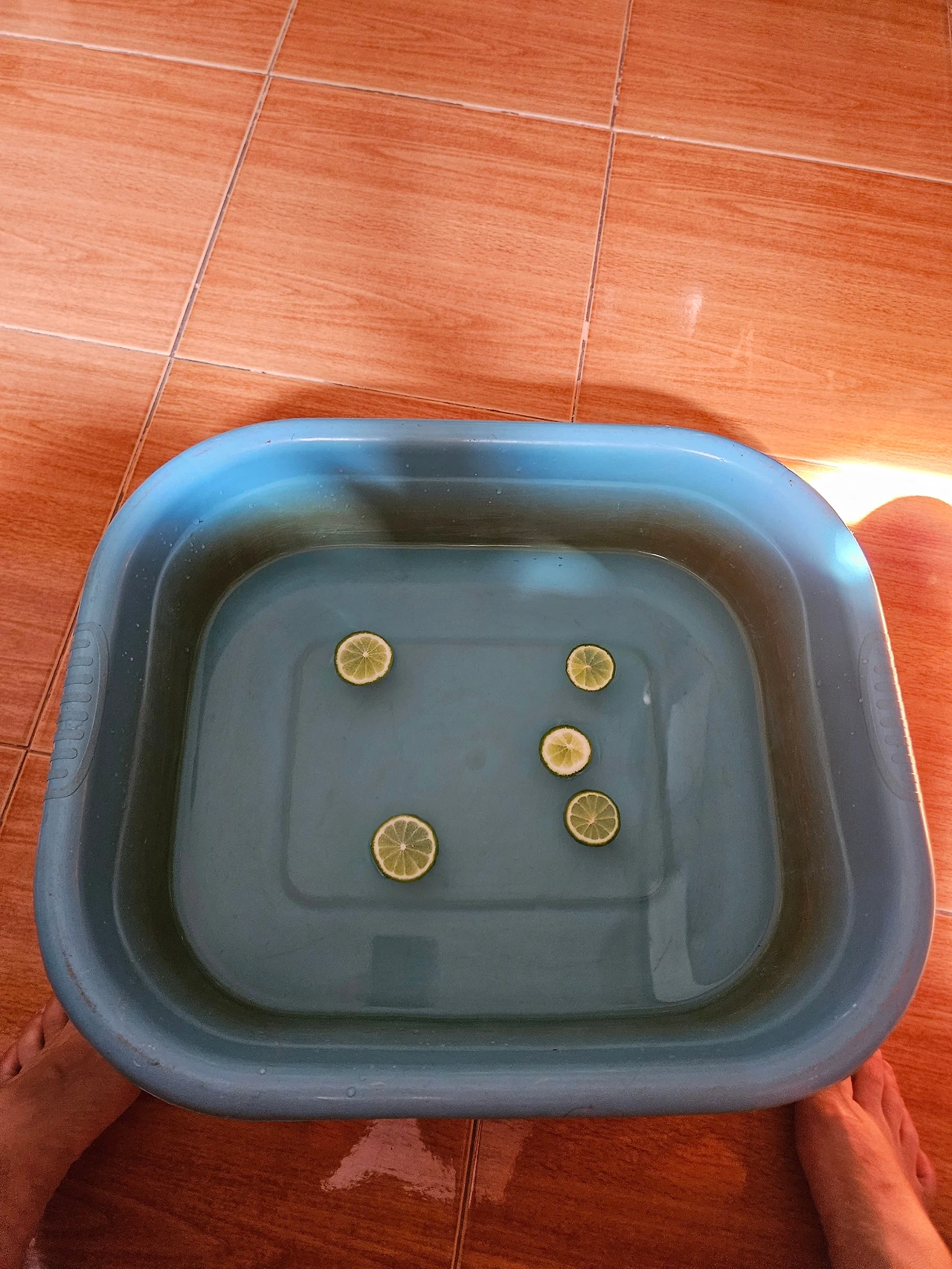 1시간 조금 넘은 시간 외국인 아저씨가 나간 자리에 우리를 안내한다. 플라스틱통이 네 개 있는 플라스틱 의자에 앉히더니 청귤을 담은 통에 발을 담그라고 한다. 근데 발을 씻겨주시는 분들이 나이대가 희끝한 머리에 할머니들이다. 대충 봐도 우리 부모님 나이대에 가깝다. 풋귤로 발을 닦아주시더니 수건으로 정성껏 물기를 제거해 주신다. 족욕 마친 물을 들고 가시는데 무릎이 아프신지 자리에서 일어나지 못하신다.