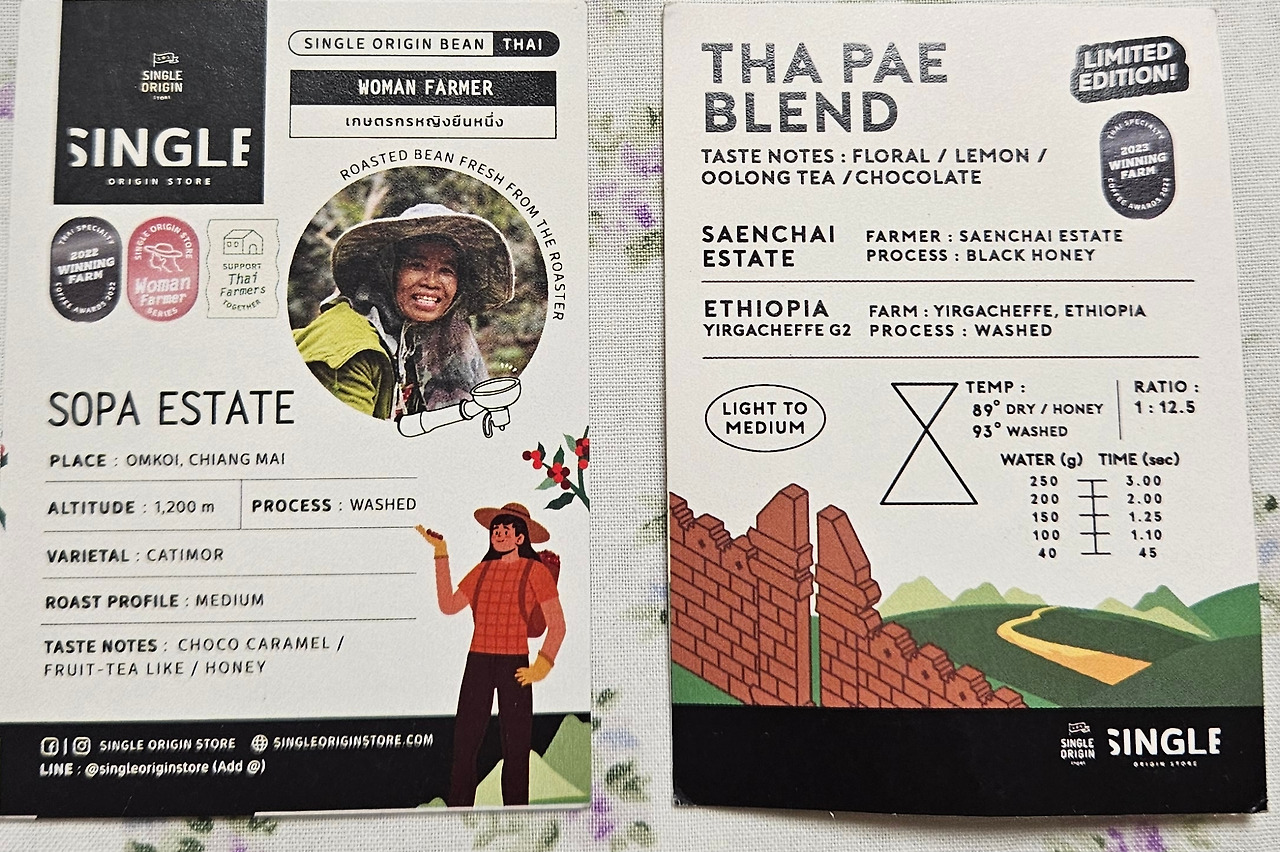 커피와 함께 제공된 원두 안내문에는 이 원두가 2022년 스페셜티 원두 우승 농장에서 제배된 것이고, 여성 농부가 제배하고, 태국의 농장을 서포트하자는 내용이 담겨있다.