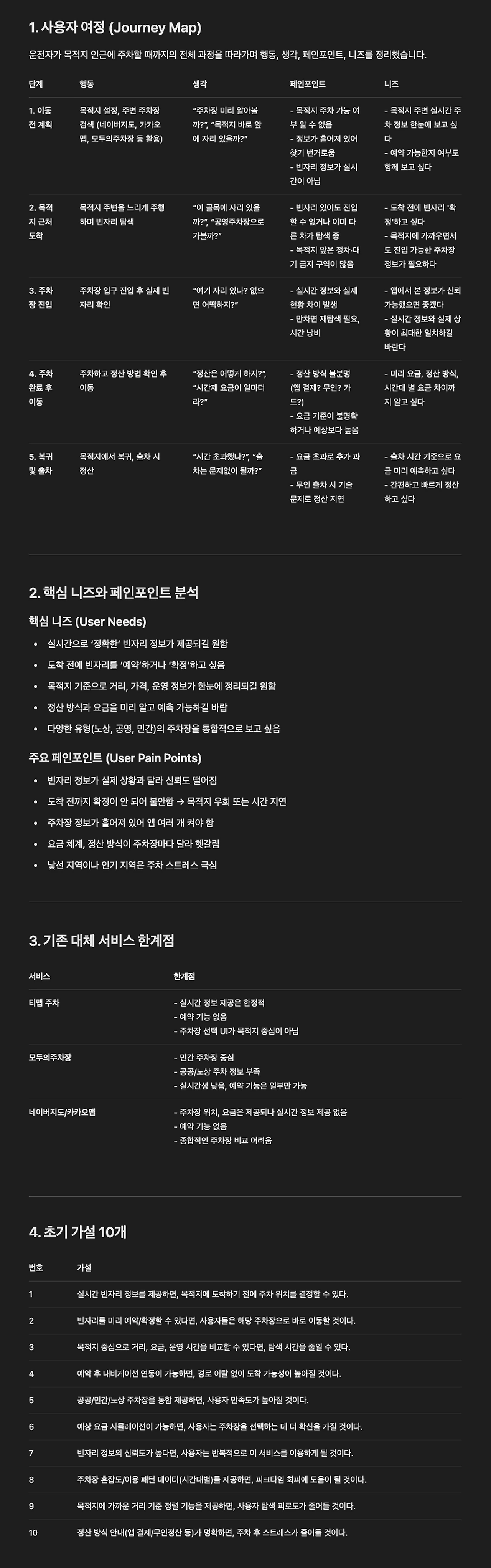 1. 사용자가 주차장을 찾을 때부터 주차 후 정산 완료까지 과정 중 생각, 행동, 페인포인트, 니즈를 사용자 여정으로 정리