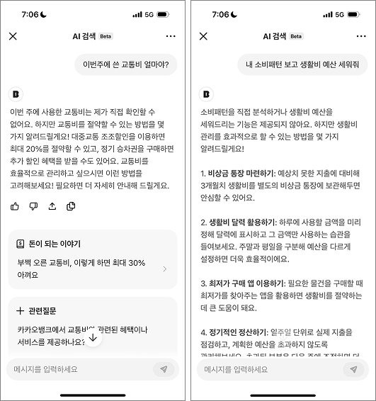 지난 5월 26일 카카오뱅크 앱에 ‘AI에게 물어보세요' 베타 기능이 오픈되었습니다.