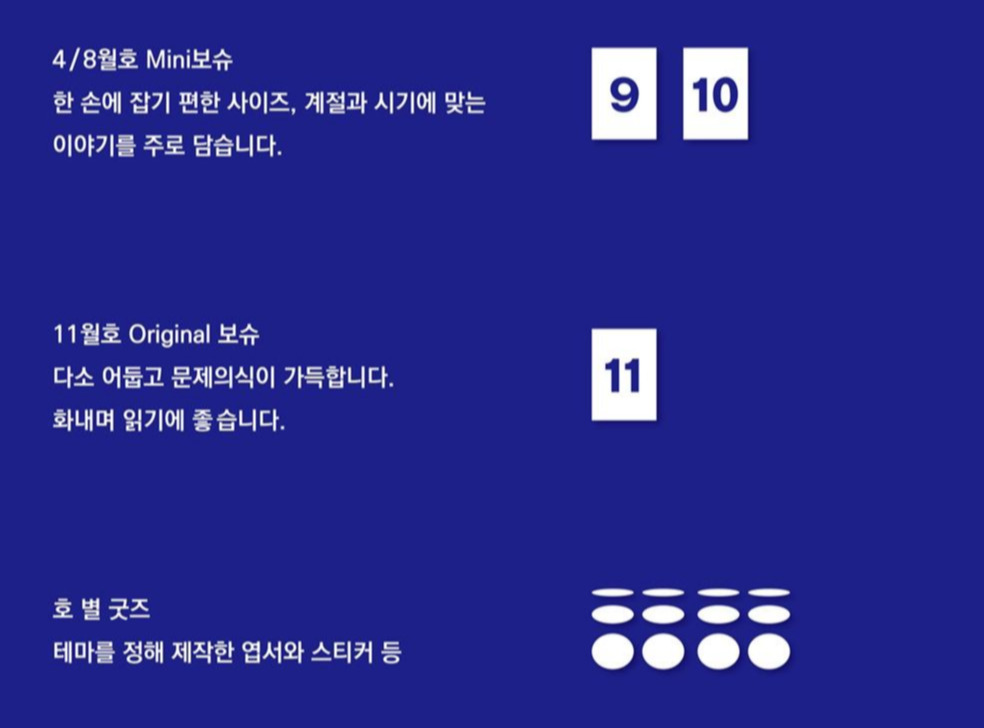 4월, 8월, 11월에 발행될 세 권과 각 호별로 테마를 정해 제작한 엽서와 스티커를 보내드릴 건데요.