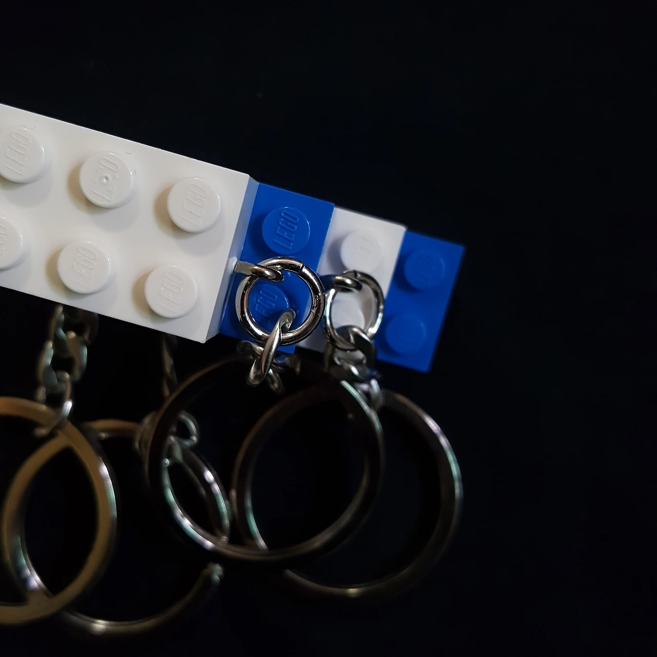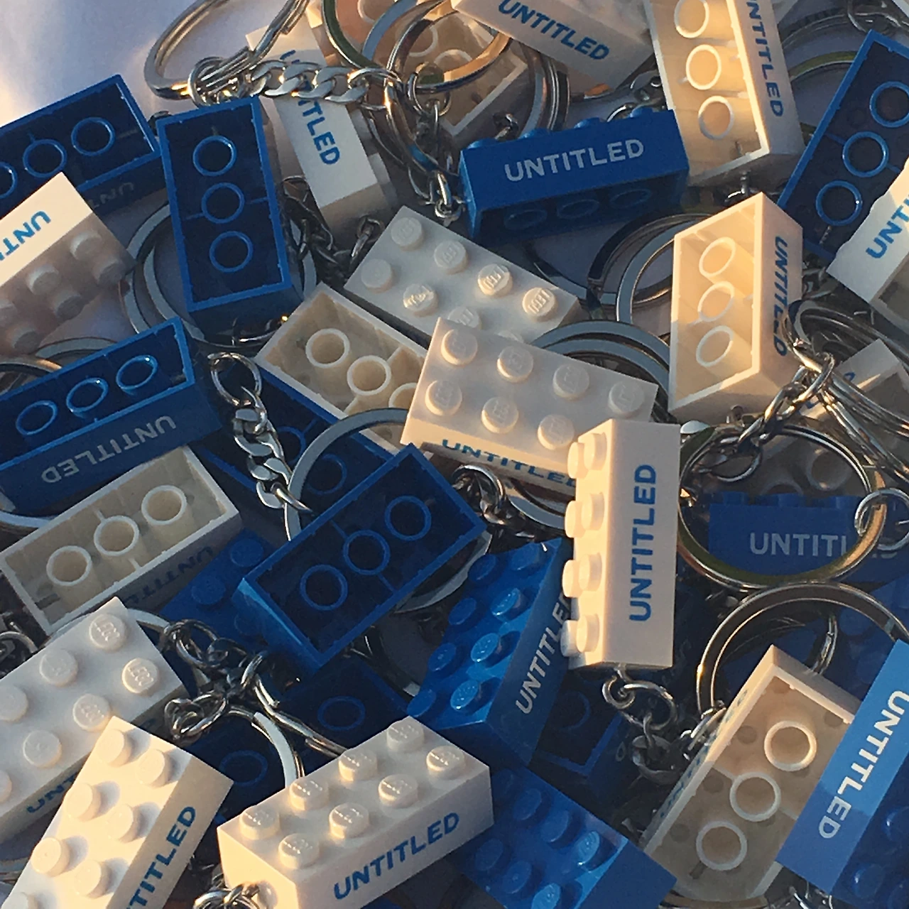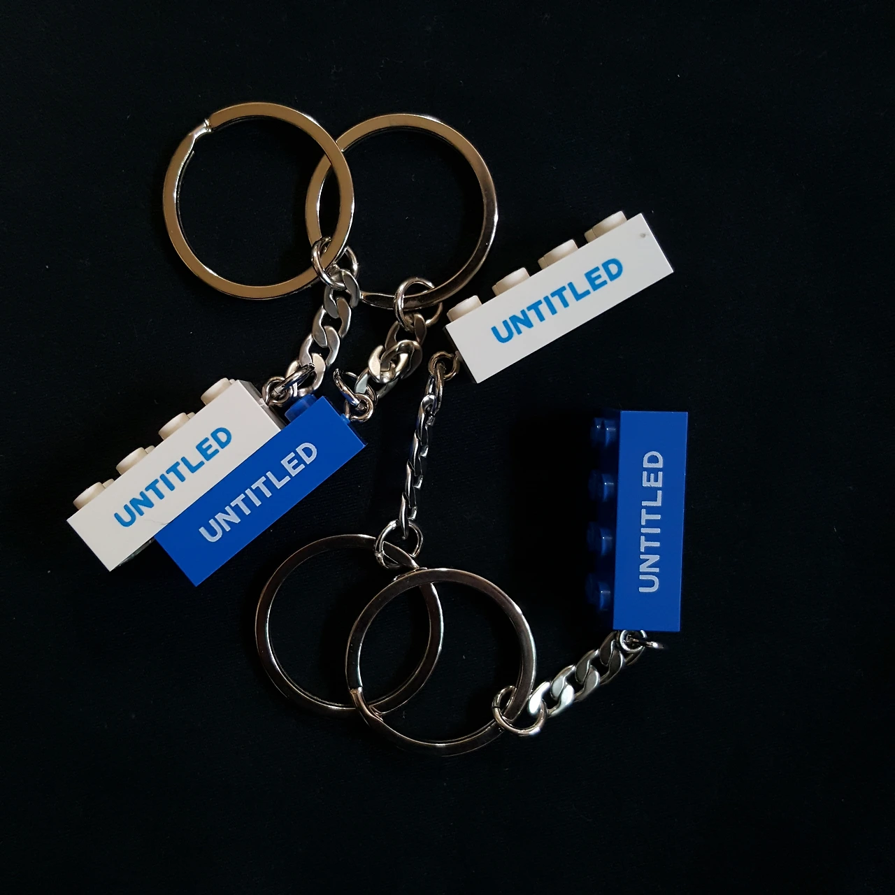 파랗고 하얀 레고 위에 Untitled가 새겨진 키링을 Untitled 멤버 모든 분께 드립니다.