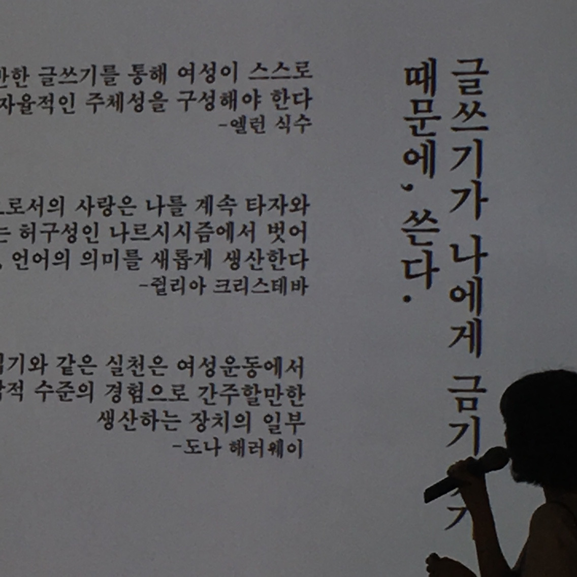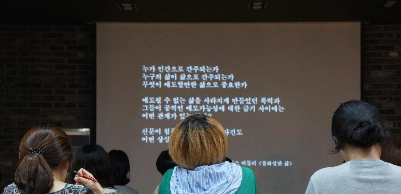 태초에 말씀이 있고 모든 이에게 해당하는 근엄한 이야기가 있다고 배워왔잖아요? 그런 것이 아니라 '나의 이야기'를 쓰자고 말하고 싶어요. 시공간을 초월한 보편성은 위험할 수 있다는 거예요. '인권은 소중하다'라는 명제에는 모두가 동의하지만, 동성애 인권이라고 하면 반대하는 사람이 있죠? 너무 추상적인 언어는 배제의 언어가 될 수 있기 때문에 내 위치성과 맥락성을 살릴 수 있도록 글을 써야 해요. 글 속의 메시지가 좀 더 날카롭게, 캐릭터가 입체적으로 살아날 수 있어요. 해러웨이가 페미니즘의 지식 이야기를 하면서 '페미니즘의 지식은 상황적이다'라는 말을 했었죠. 그런 건 어떻게 가능할까요.