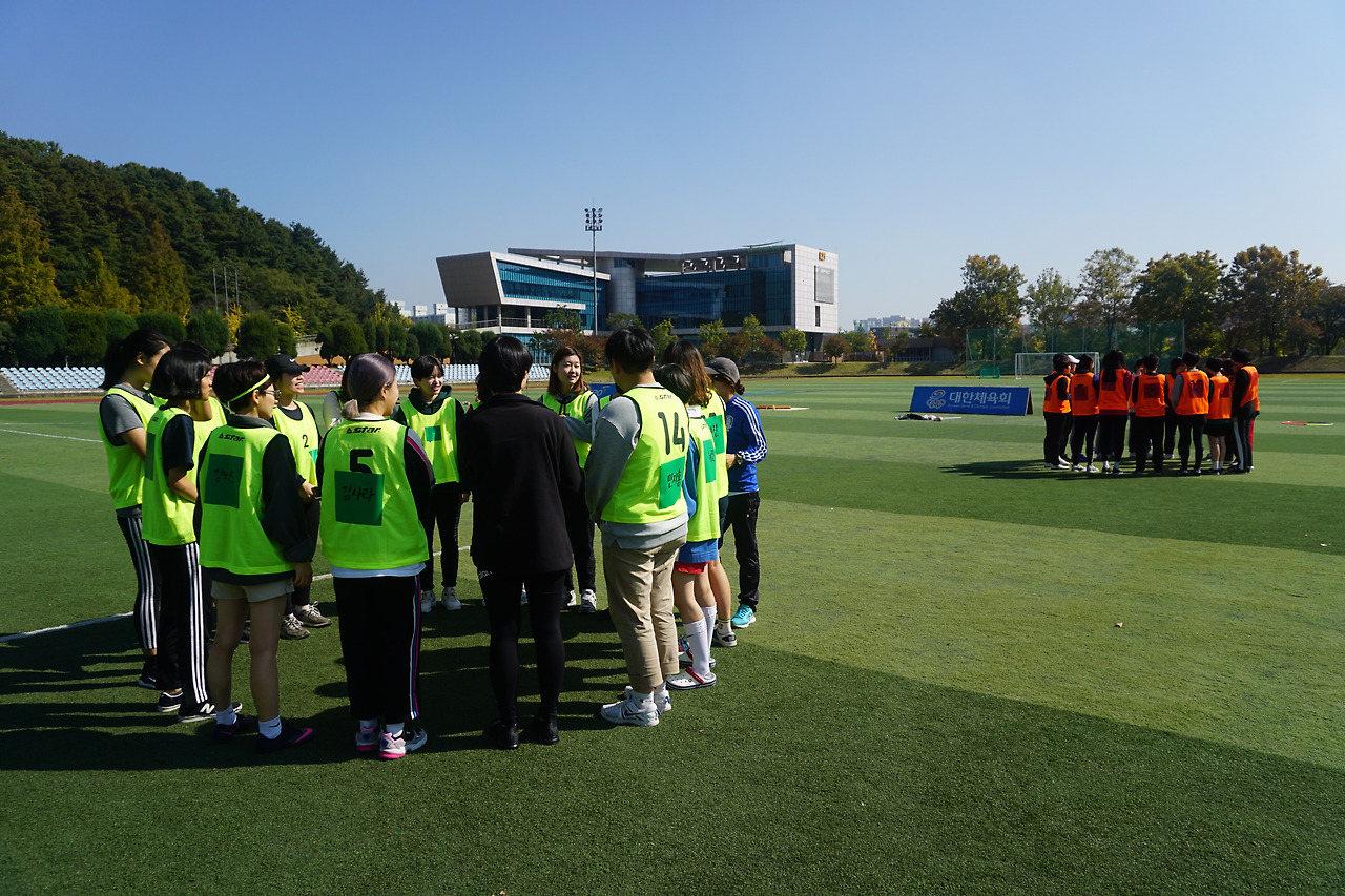 FC우먼스 플레잉 이선희 코치님의 구령과 국민체조 BGM에 맞춰 준비운동을 했습니다.