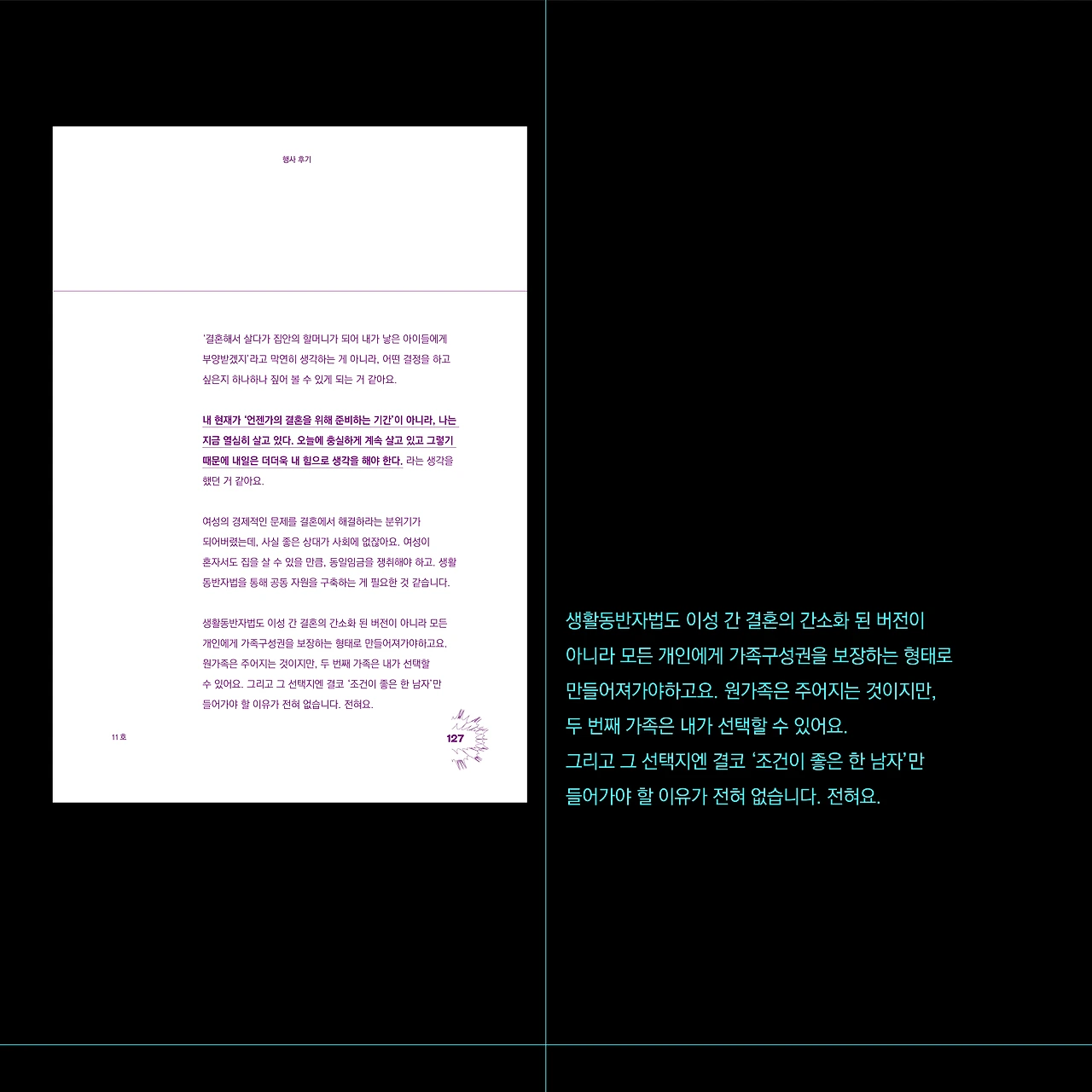 “생활동반자법도 이성 간 결혼의 간소화된 버전이 아니라 모든 개인에게 가족 구성권을 보장하는 형태로 만들어져가야 하고요. 원가족은 주어진 것이지만 두 번째 가족은 내가 선택할 수 있어요. 그리고 그 선택지엔 결코 ‘조건이 좋은 한 남자’만 들어가야 할 이유가 전혀 없습니다. 전혀요.”