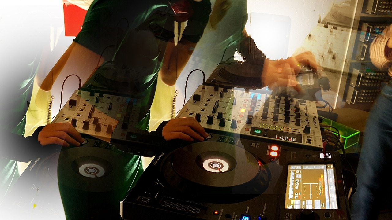 여성DJ가 음악을 틀고, 여성들과 춤추는.