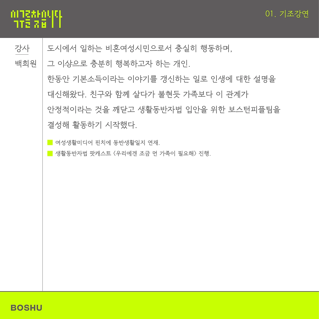 강연이 끝나면 BOSHU팀의 비혼 시리즈 프로그램을 설명해드릴 거예요. 비혼 여성으로서 다양한 삶을 상상해보고 페미니스트 동료를 만나고 싶은 분들의 많은 참여를 바랍니다!