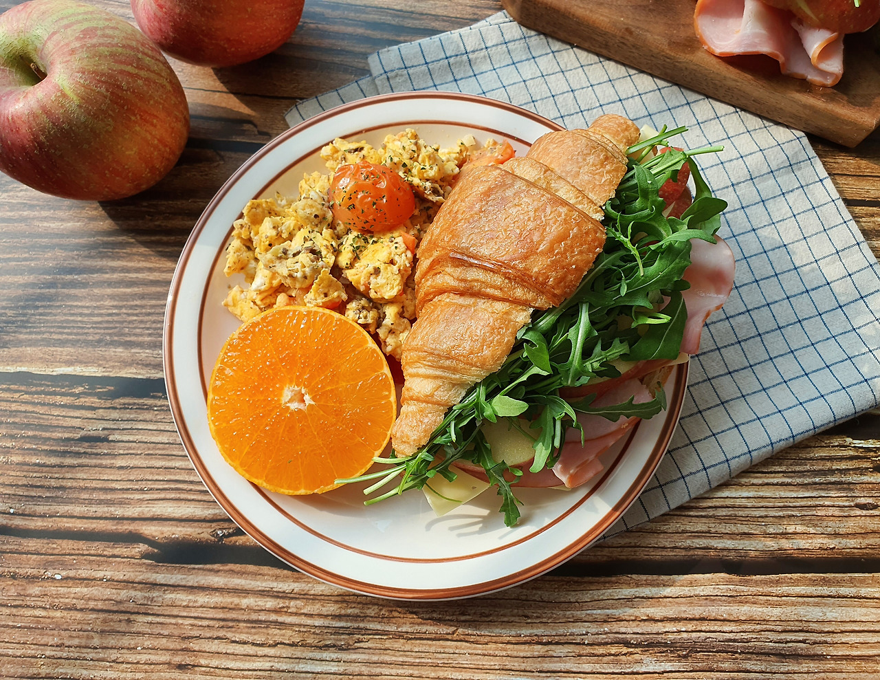 겹겹이 고소한 크루아상에 아삭한 사과와 쌉싸래한 와일드 루꼴라, 두말하면 입 아픈 햄과 치즈의 조합 만으로도 훌륭하지만 여기에 맛을 배가 시켜줄 스프레드를 더했다. 간편 요리인 토마토 달걀 볶음의 고급스러운 변신까지 함께 하니 식탁에 앉는 순간 유럽 어느 호텔 조식 부럽지 않은 맛을 선사할 것이다.