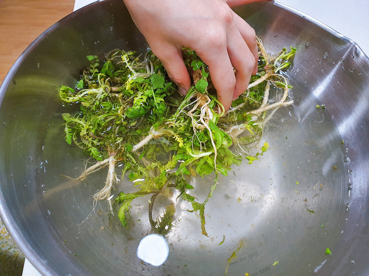 2. 손질 마친 냉이를 물 9C:식초 1C 분량의 식초 물을 만들어 20분간 담가 둔다.