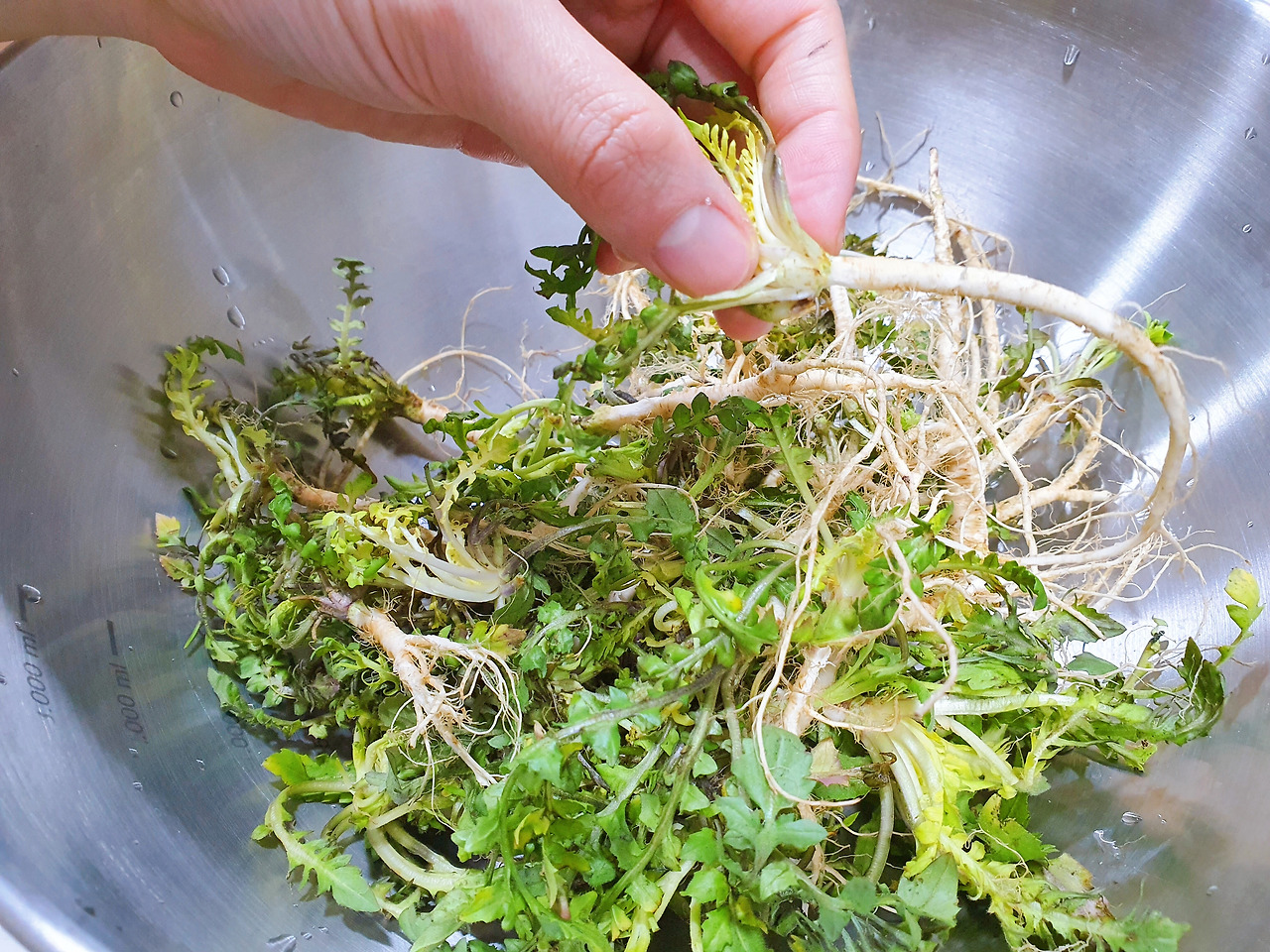 1. 냉이는 시들고 누런 잎을 정리하고 뿌리 부분을 살살 칼로 긁어내 흙과 잔뿌리를 제거한다. 이때, 뿌리와 잎 사이의 거뭇한 홈을 파내듯 긁어 깨끗이 손질해주어야 한다.