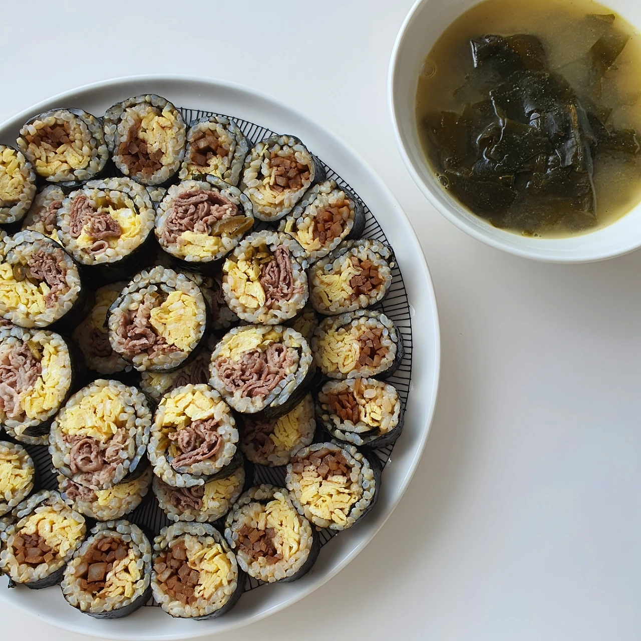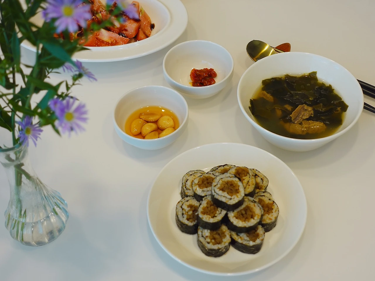 소고기 달걀 김밥과 우엉 달걀 김밥으로 차려낸 아침 테이블. 이 날은 맑은 미역국을 곁들였어요.이건 개인적인 취향인데, 담백한 우엉 김밥 위에 낙지 젓갈이나 오징어 젓갈을 살짝 얹어 먹으면 조합이 아주 그럴싸합니다. 물론 김밥에는 김치 하나만 있어도 완벽하지만요.