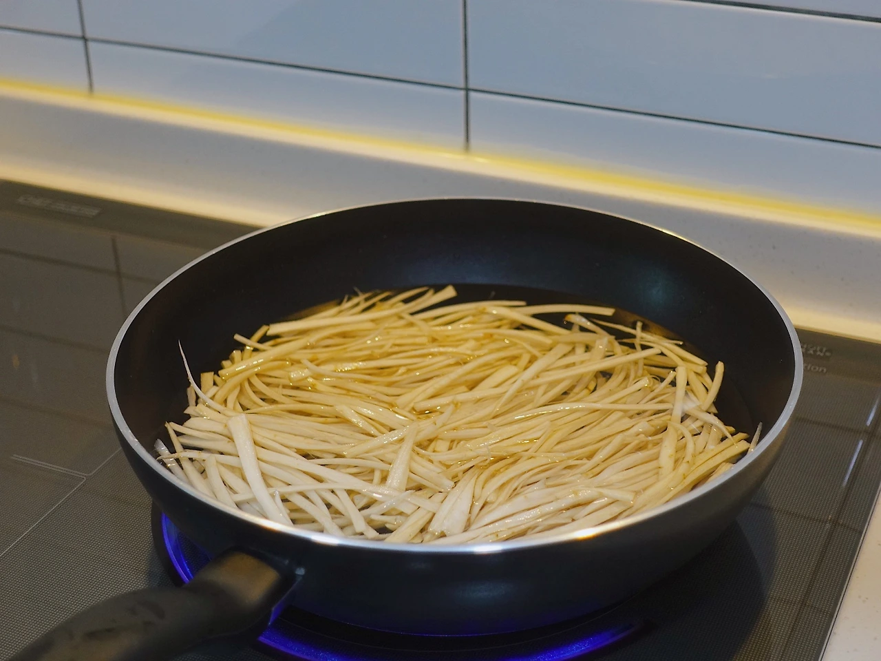 1. 우엉은 껍질을 벗겨 가늘게 채를 썰고 식초물에 담가 둔다.