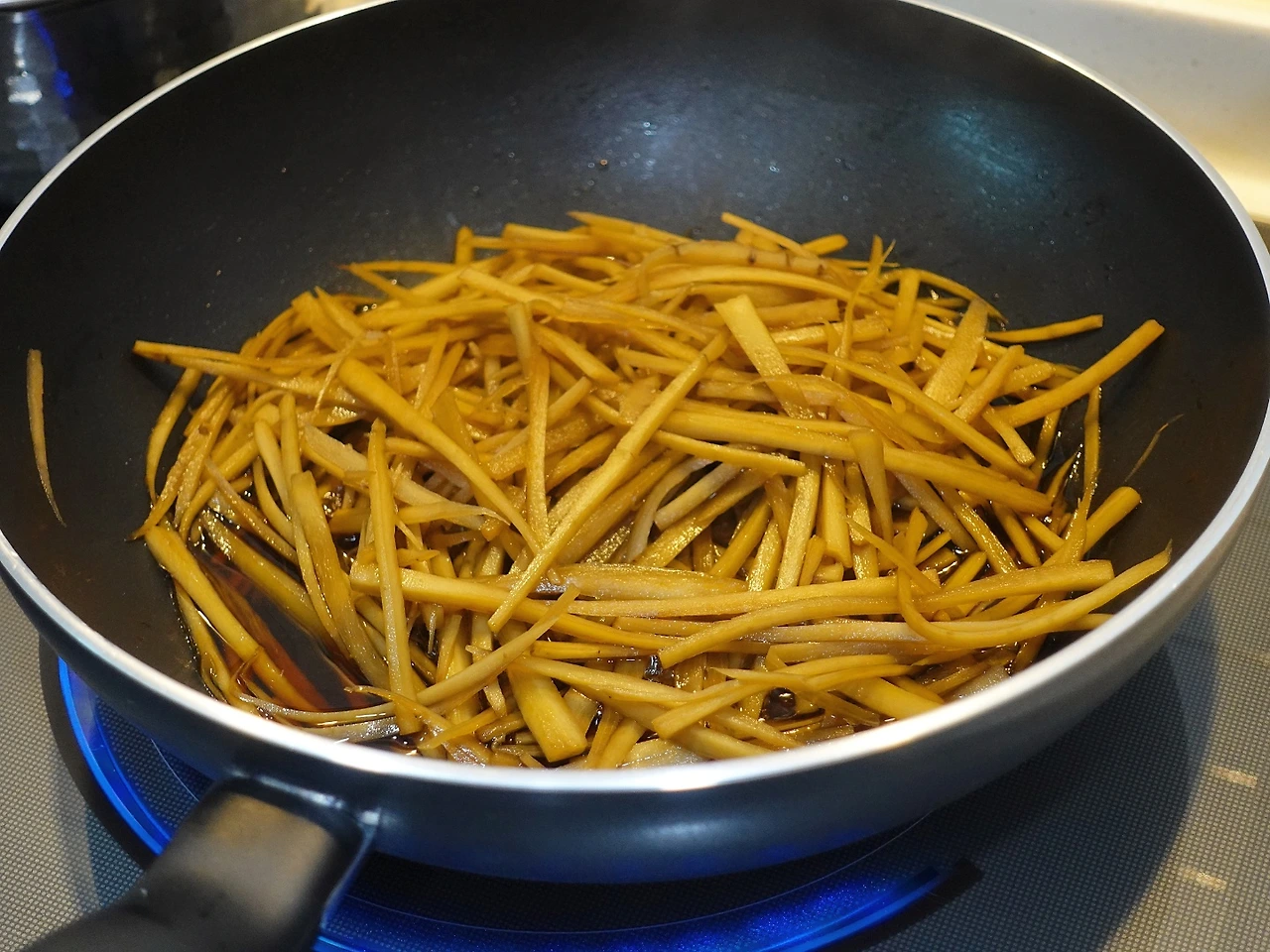 나무 막대기 같은 우엉의 근사한 변신이 기다려지는 시간. 손질을 끝낸 우엉은 식초물에 담긴 그대로 냄비에 부어 한소끔 끓여 내요. 물이 끓어오르면 3분 정도 더 팔팔 끓인 후 물을 따라내고 찬물에 한번 헹궈냅니다. 그런 다음 다시 깨끗한 새 물을 받아 양념장과 함께 졸여내면 되는 어렵지 않은 요리예요. 껍질을 벗기고 채 써는 시간이 수고스러워 그렇지, 이마저도 채 칼 같은 장비의 도움을 받는다면 별 일이 아니게 되지요.