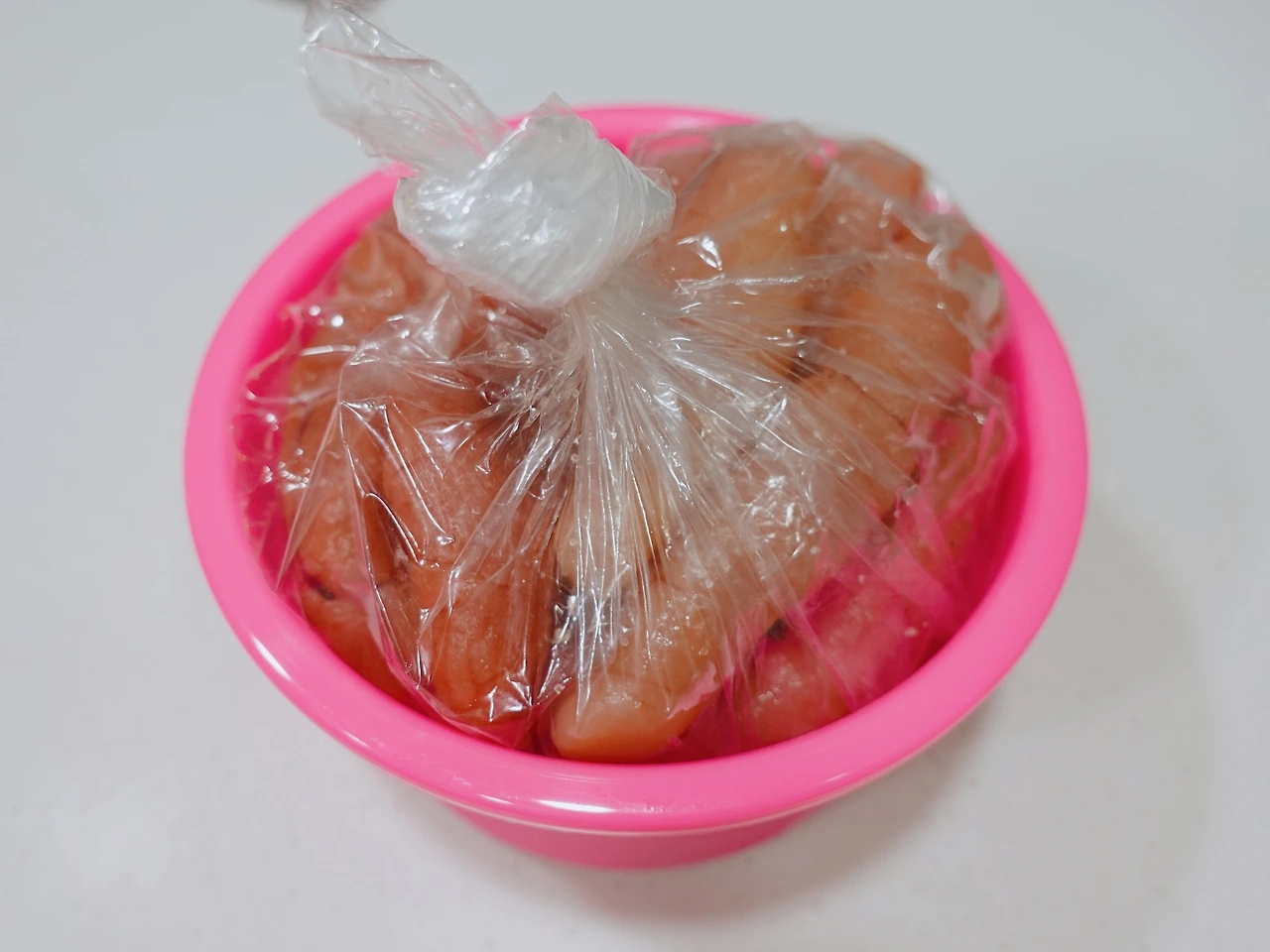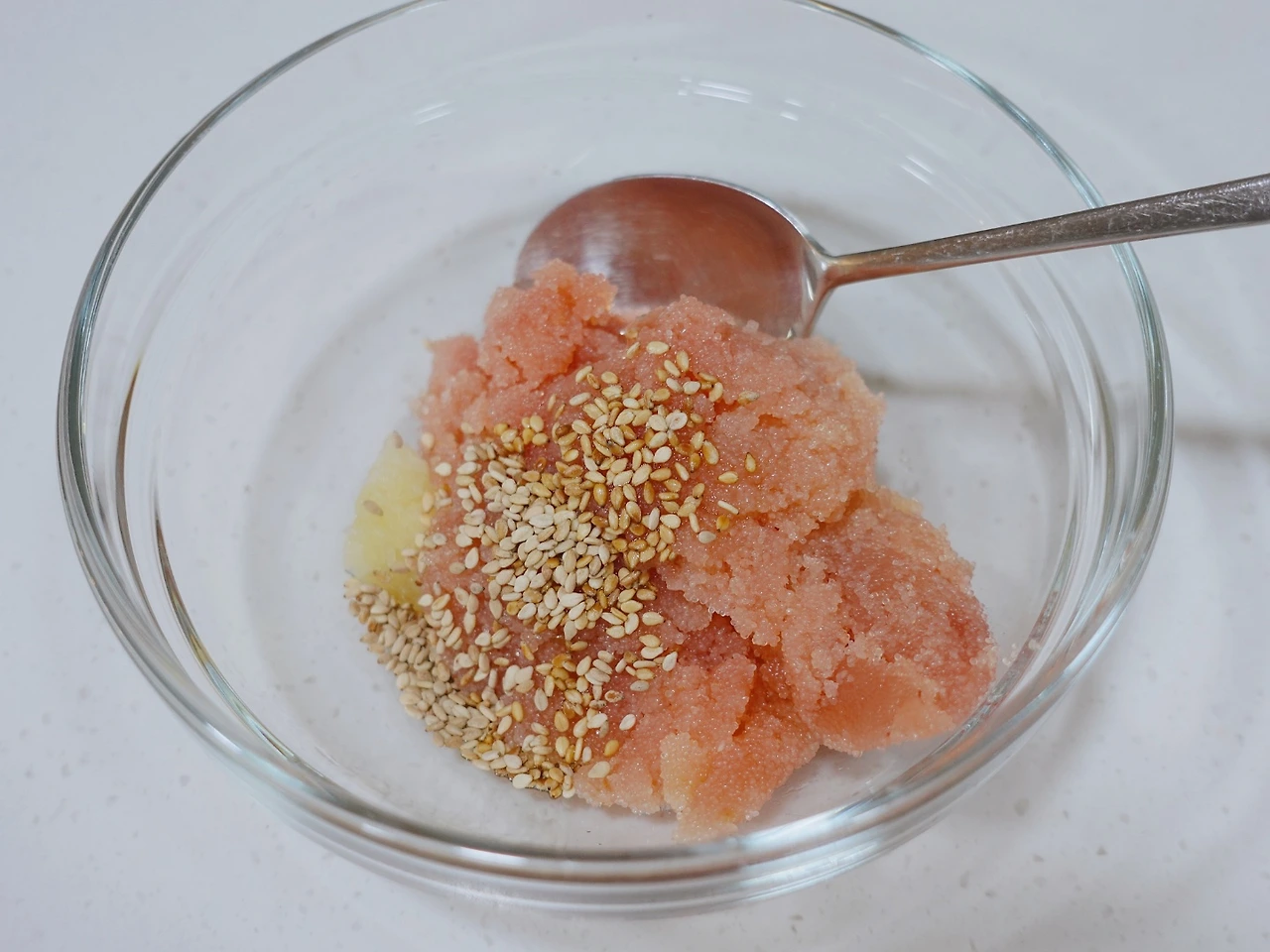 1. 명란은 길이로 반을 갈라 칼이나 젓가락으로 살살 긁어 알만 모아둔다.