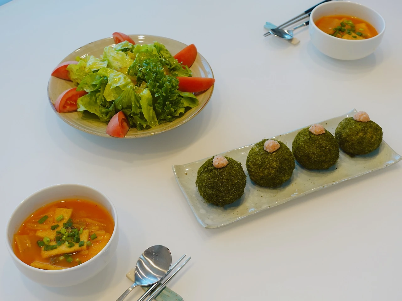 4. 양념한 밥을 한 주먹 크기로 잡아 넓게 펼치고 그위로 (2)에서 만든 명란 무침을 넣은 다음 동그랗게 뭉쳐 주먹밥을 만든다.