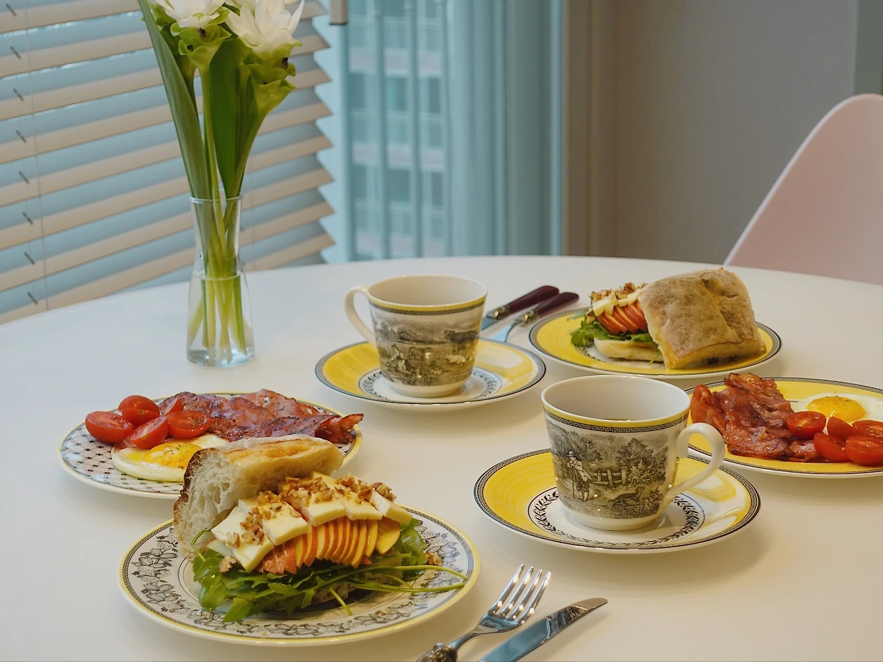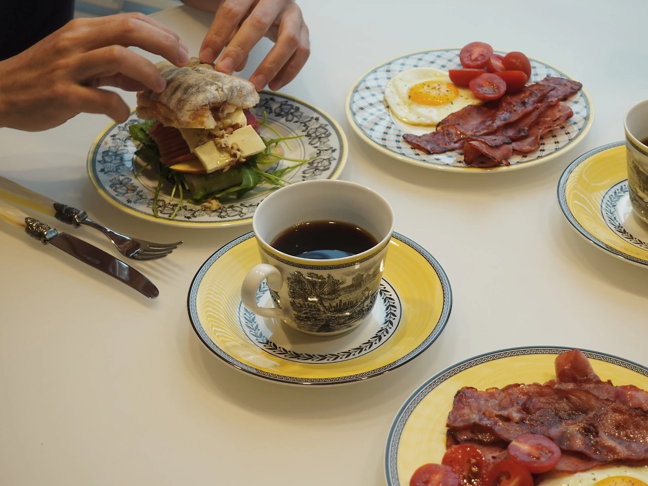사과 브리치즈 샌드위치, 베이컨 구이와 달걀, 방울토마토 그리고 따뜻한 커피를 곁들인 아침.