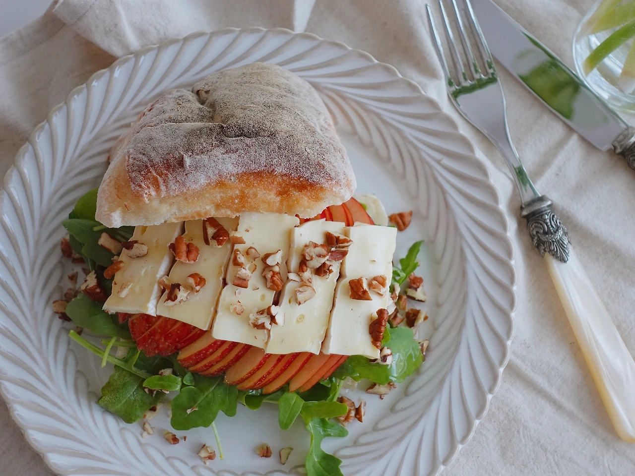 치아바타, 와일드 루꼴라, 사과, 브리치즈, 피칸 또는 호두, 홀그레인 머스터드, 꿀