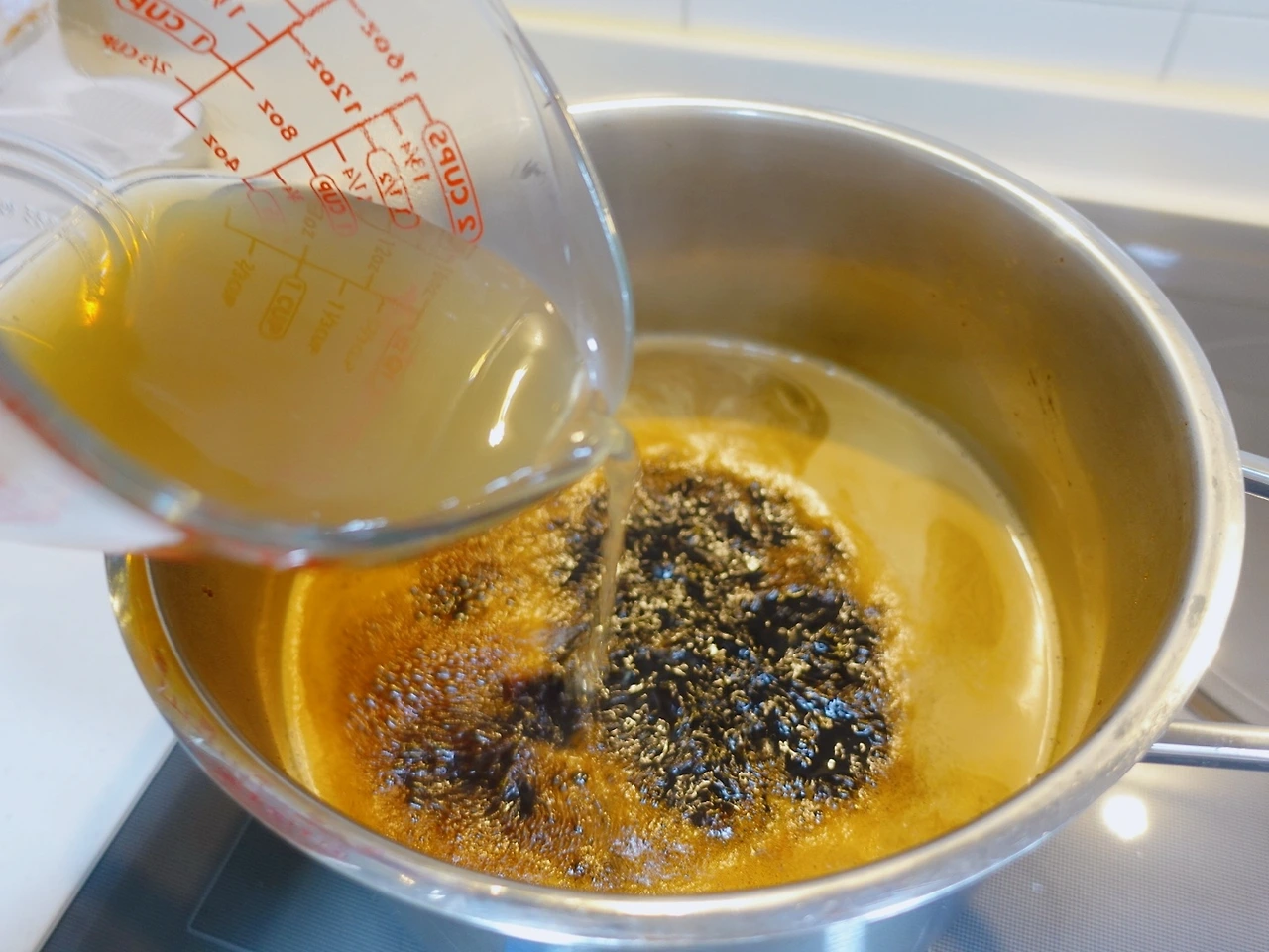 3. 새 냄비에 간장과 마스코바도를 넣어 끓이다가 끓어오르면 불을 중 약불로 줄이고 (1)의 육수, 청주, 미림을 넣어 20분간 더 끓인다.