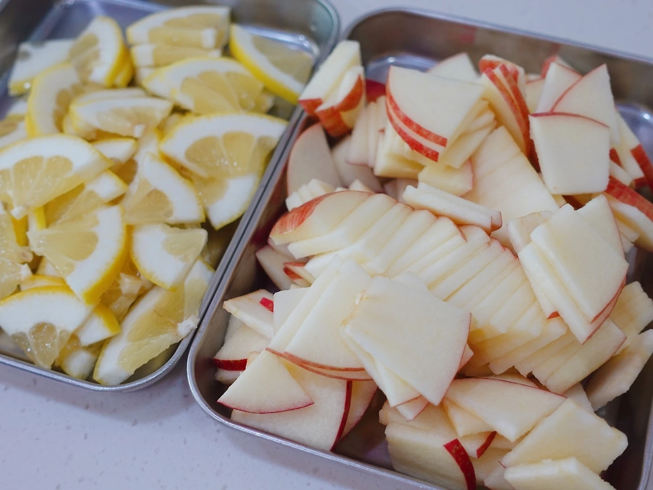2. 레몬과 사과는 씨를 제거하고 얇게 슬라이스 해 준비한다.