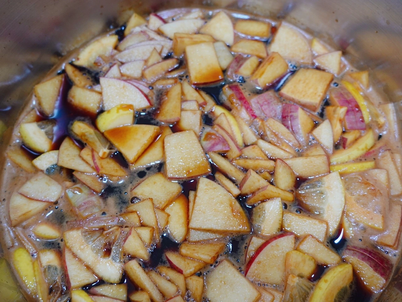 4. 불을 끄고 썰어 둔 레몬과 사과를 넣고 뚜껑을 닫는다. 선선한 곳에서 24시간 동안 둔다.