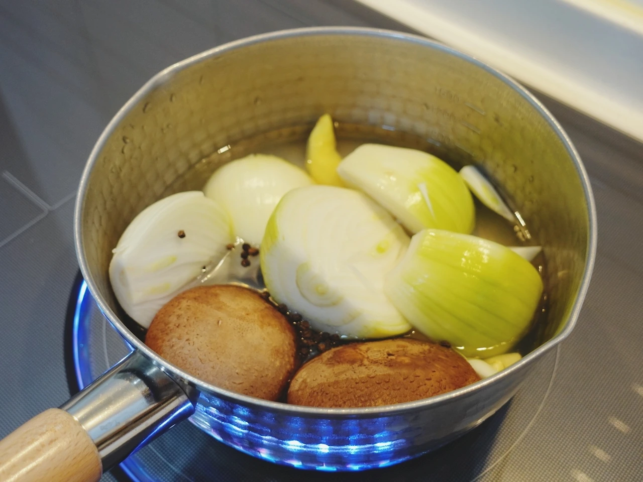 1. 냄비에 물 400ml와 양파, 표고버섯, 마늘, 생강, 통후추를 넣고 절반의 용량이 될 때까지 약불에서 서서히 졸인 후 육수만 걸러낸다.