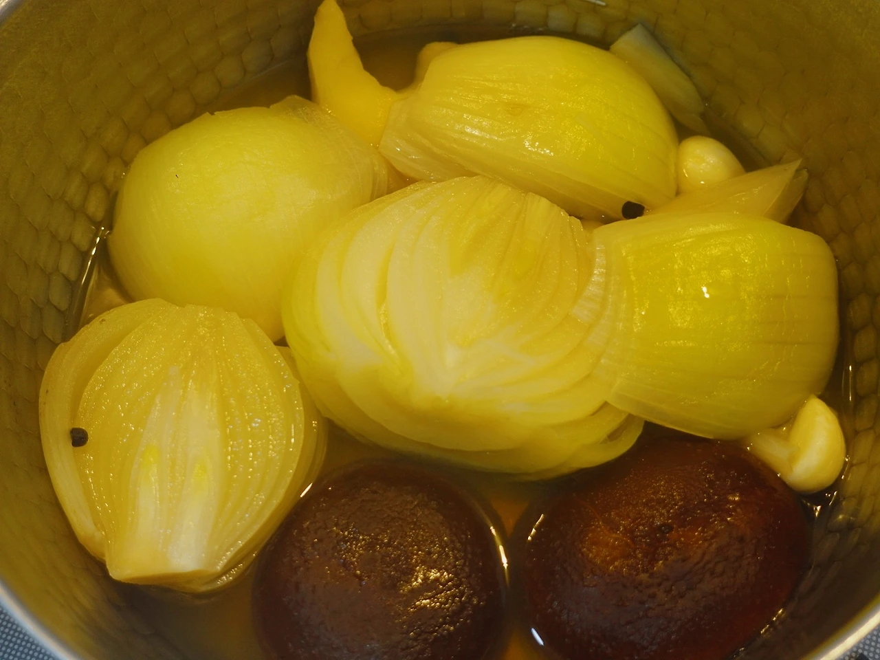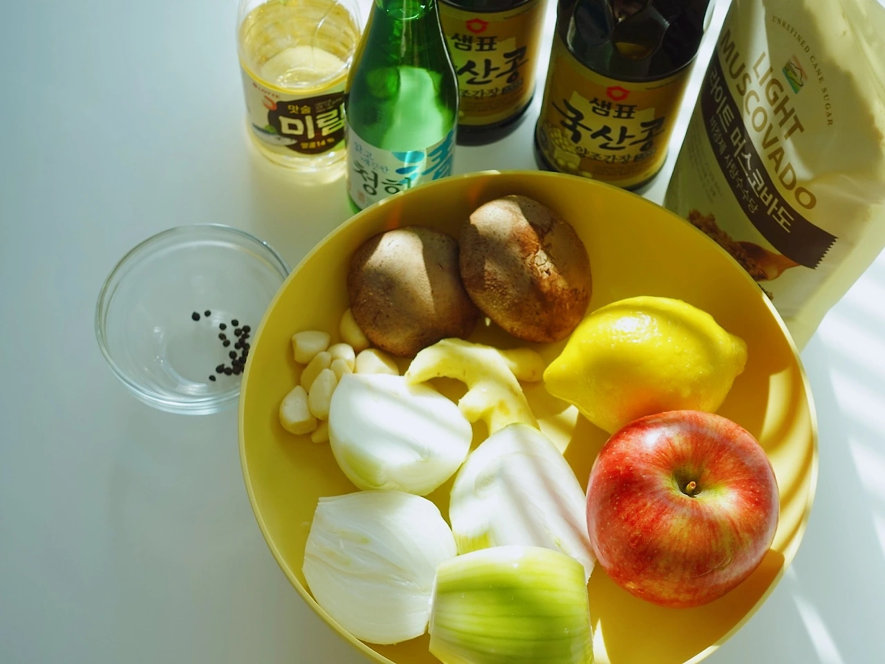 양파 2, 표고버섯 2, 레몬 1, 사과 1, 마늘 10톨, 생강 1톨, 통후추 1/4ts, 물 400ml, 청주 200ml, 미림 400ml