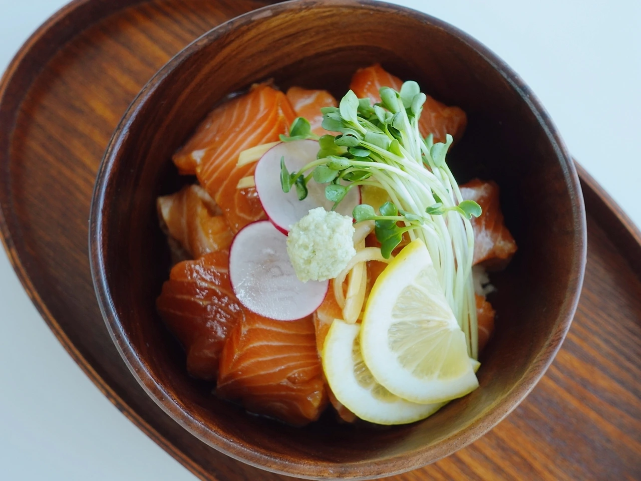 5. 그릇에 밥을 퍼담고 연어로 밥을 덮듯이 둘러 올린 다음 절인 양파와 소스 두세 스푼을 더한다. 고추냉이와 레몬, 무순을 얹어 마무리한다.