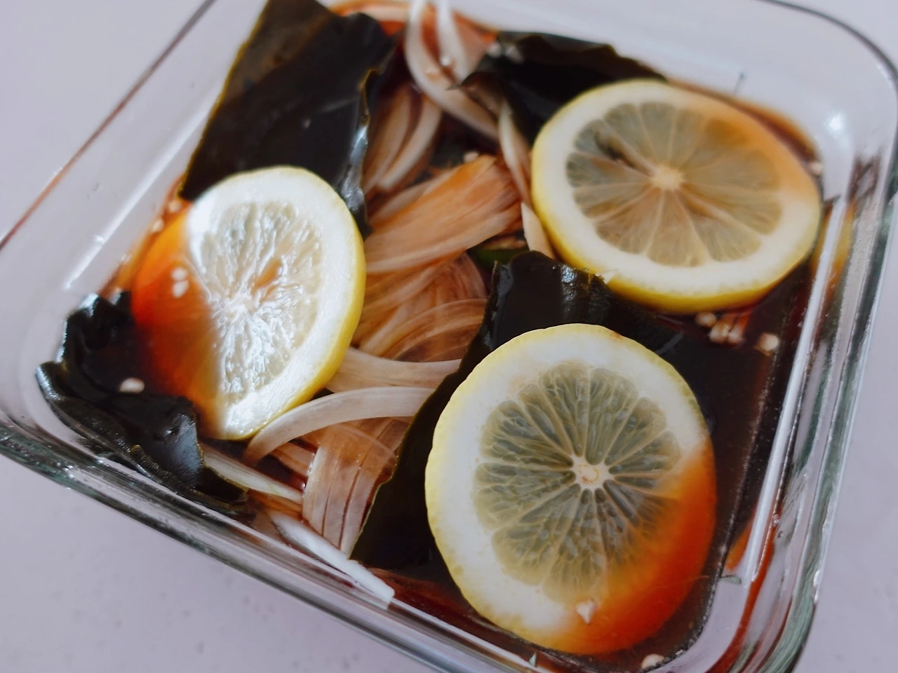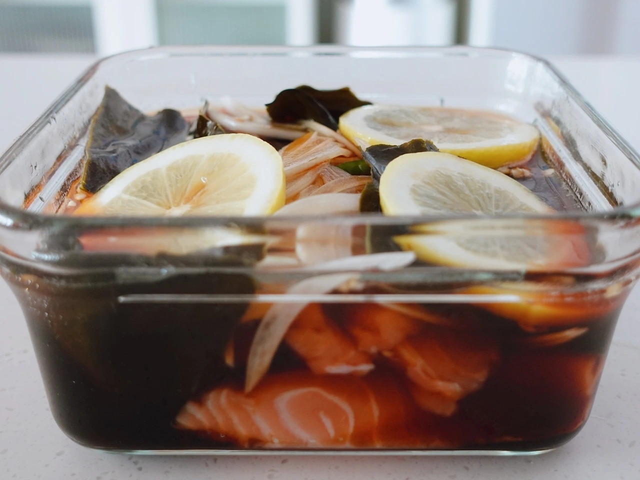4. 고추, 양파, 레몬, 다시마를 연어장에 섞고 8시간 이상 냉장 숙성시킨다.