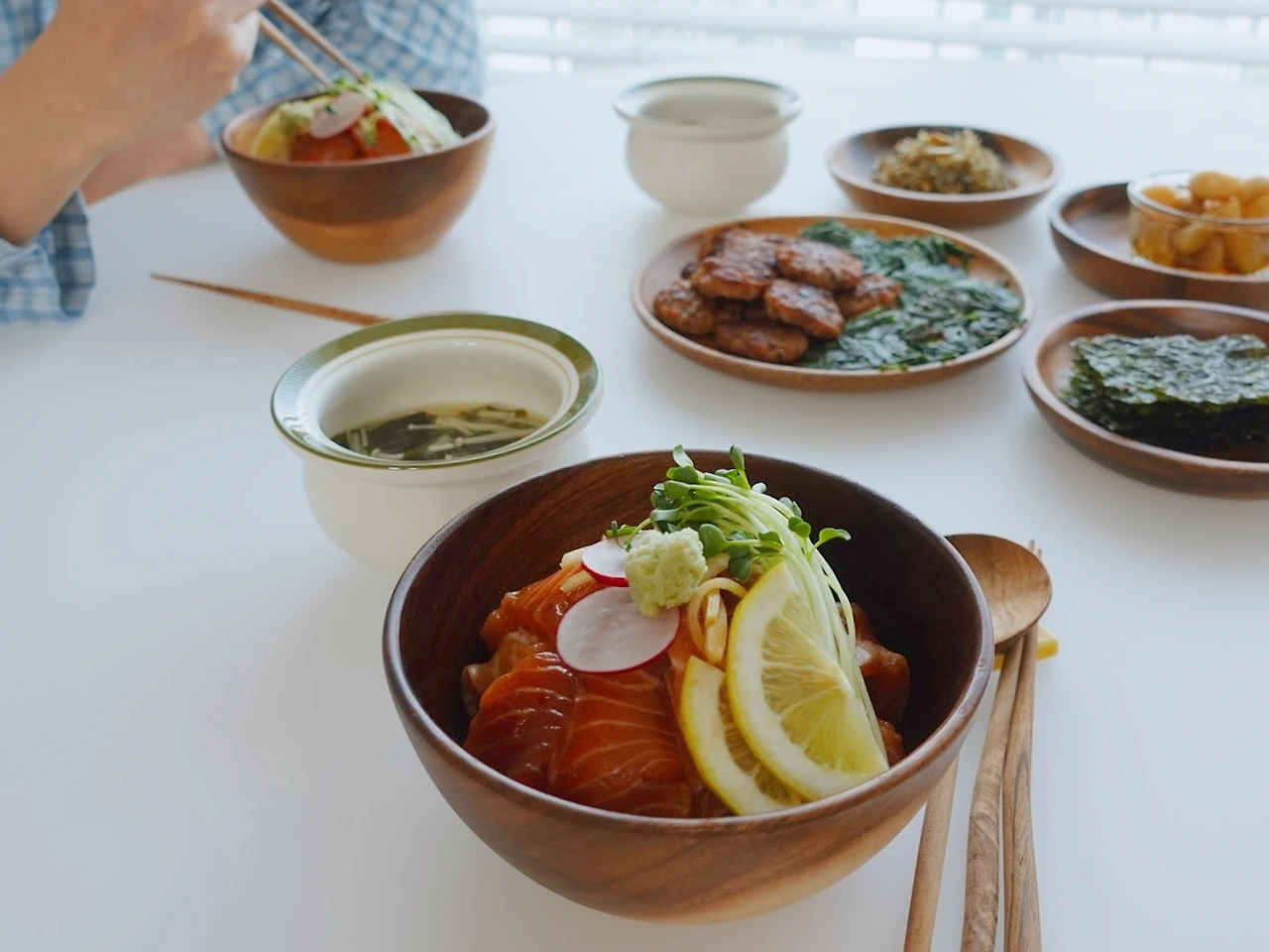 생연어, 맛간장, 물, 미림, 청주 , 청양고추, 양파, 다시마, 고추냉이, 레몬, 무순(생략 가능), 밥